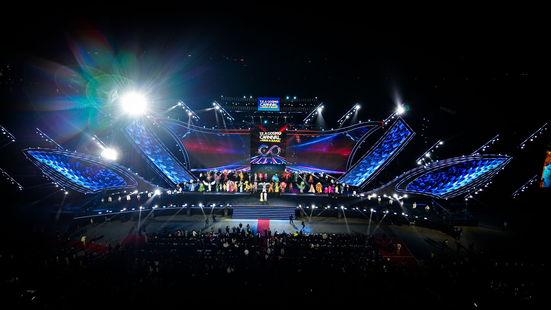 Một trong những điểm nhấn của đêm khai mạc là sân khấu T.E.A Cosmo Carnival, nơi gần 80 thí sinh Miss Cosmo 2025 trình diễn trang phục Carnival Costume. Màn trình diễn đã mang đến một bức tranh đa dạng về văn hóa thế giới, góp phần lan tỏa hình ảnh Lâm Đồng như một điểm đến của trà và giao lưu quốc tế.