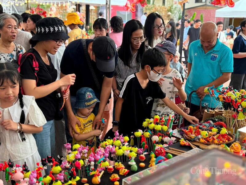 Gian hàng tò he - một sản phẩm của làng nghề tò he Xuân La (Hà Nội) thu hút đông đảo các em nhỏ và phụ huynh, tạo nên một không gian văn hóa tuổi thơ sống động giữa lòng lễ hội hiện đại