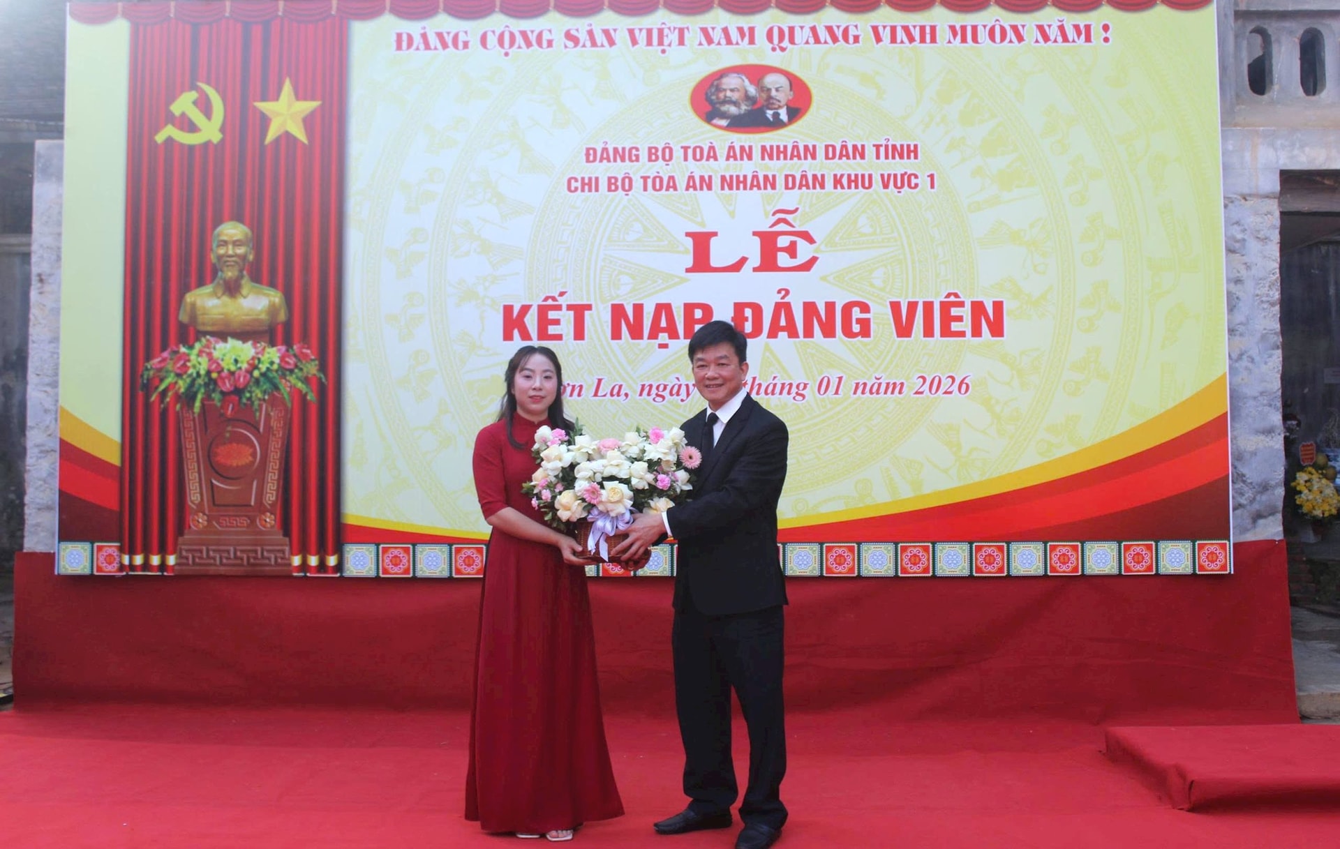 Đồng chí Cầm Xuân Thủy, Phó Bí thư Đảng ủy, Phó Chánh án Tòa án nhân dân tỉnh Sơn Latặng hoa chúc mừng đảng viên mới.
