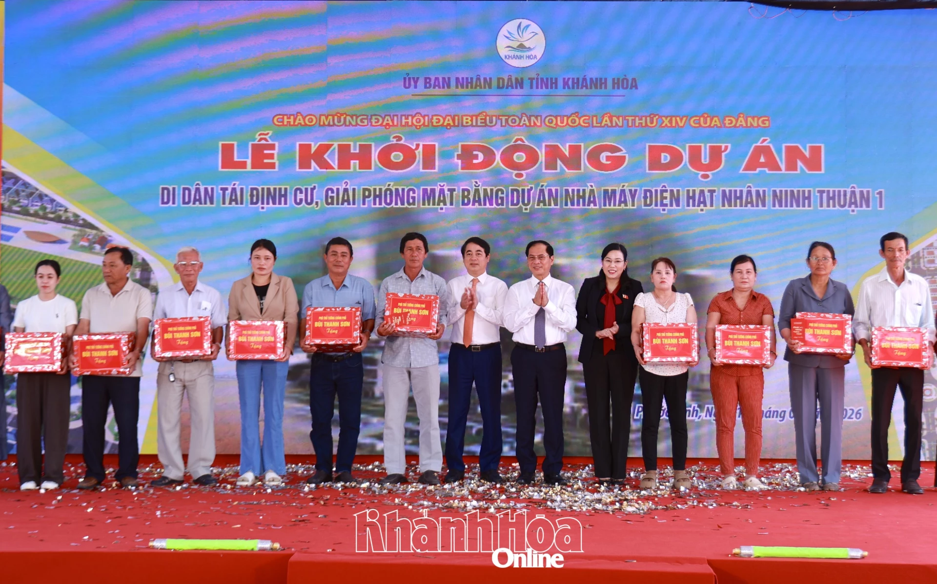 Tại buổi lễ, các đồng chí lãnh đạo Trung ương và địa phương đã thực hiện nghi thức khởi động Dự án Di dân, tái định cư, giải phóng mặt bằng Nhà máy Điện hạt nhân Ninh Thuận 1. Dịp này, ban tổ chức đã trao 30 suất quà cho các hộ dân trong vùng dự án, thể hiện sự quan tâm, chia sẻ, động viên người dân sớm ổn định cuộc sống, đồng hành cùng địa phương trong quá trình triển khai dự án trọng điểm quốc gia.