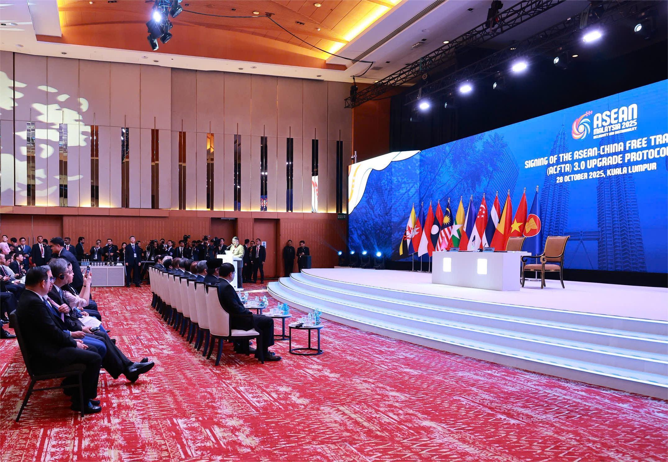 Sáng ngày 28/10/2025, trong khuôn khổ Hội nghị Cấp cao ASEAN lần thứ 47 và các hội nghị cấp cao liên quan đã diễn ra Lễ ký Nghị định thư nâng cấp Hiệp định Thương mại tự do ASEAN - Trung Quốc (ACFTA 3.0) tại Trung tâm Hội nghị Kuala Lumpur, Malaysia, với sự chứng kiến của Lãnh đạo cấp cao các nước ASEAN và Trung Quốc.