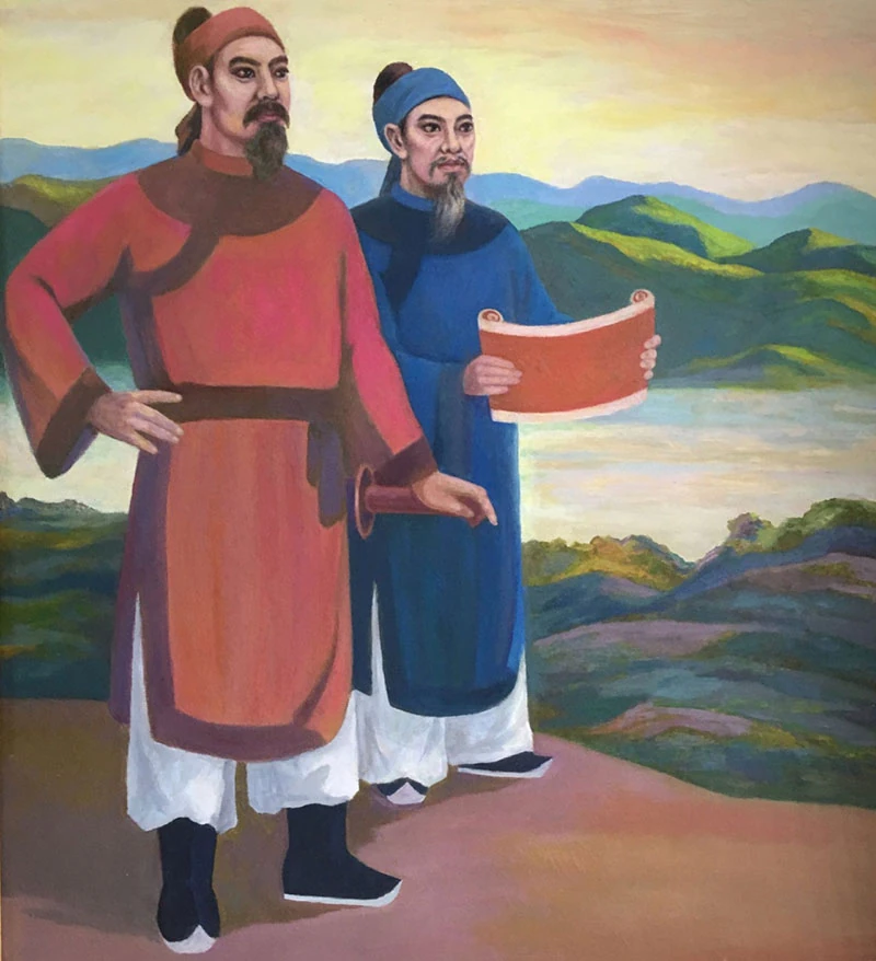 Nguyễn Trãi dâng lên Lê Lợi Bình Ngô sách tại căn cứ khởi nghĩa Lam Sơn. (Tranh: Hoàng Hoa Mai)