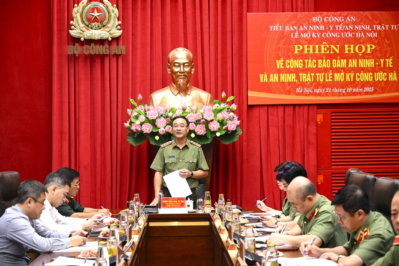 Đại tá Nguyễn Thị Phương, Phó Chánh Văn phòng Bộ Công an báo cáo tóm tắt kiểm điểm, đánh giá công tác bảo đảm an ninh, trật tự, y tế Lễ mở ký. Tại Phiên họp, đại diện lãnh đạo Văn phòng Bộ Công an đã công bố các quyết định về việc thành lập các Tiểu ban và báo cáo tóm tắt kiểm điểm, đánh giá công tác bảo đảm an ninh, trật tự, y tế Lễ mở ký; Cục An ninh mạng và Phòng, chống tội phạm sử dụng công nghệ cao báo cáo một số thông tin, tình hình được cập nhật, bổ sung liên quan...