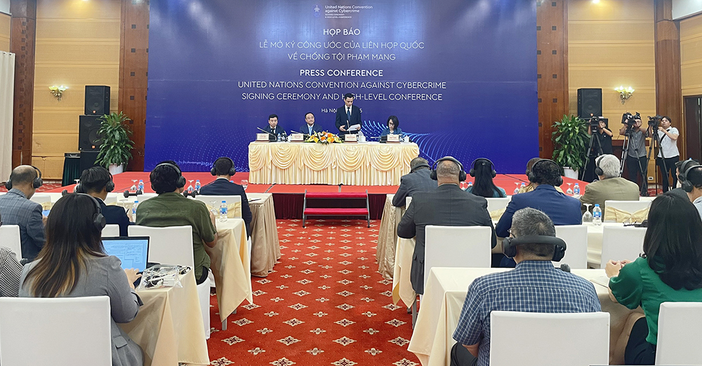 Họp báo quốc tế về Lễ mở ký Công ước của Liên hợp quốc về chống tội phạm mạng, ngày 8-10 tại Hà Nội. Ảnh: ANH VŨ