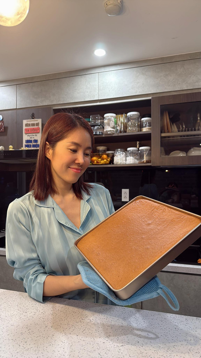 Gần đây, nữ diễn viên có sở thích vào bếp để tự tay làm bánh cho chồng con thưởng thức. (Ảnh FBNV)