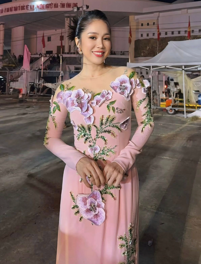 Trong đêm diễn, Lê Phương lựa chọn áo dài hồng thêu hoa lớn nổi bật, tôn lên vẻ đẹp mặn mà, đằm thắm. Giữa không gian quảng trường rộn ràng thời khắc chuyển giao năm mới, nữ diễn viên xuất hiện rạng rỡ, tràn đầy năng lượng. Cô cũng thẳng thắn chia sẻ về tạo hình tóc búi gọn gàng: “Tại quảng trường gió mạnh lắm nên không thể xõa tóc, kiểu áo cũng không thể làm tóc rườm rà trông sẽ rất nặng nề, nên tóc búi là phù hợp nhất!”.