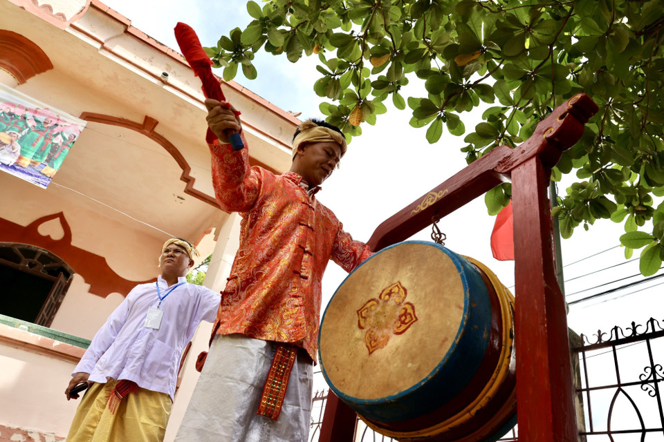 Đúng 12 giờ tiếng trống rộn rã gọi bà con về đền làng Hữu Đức dự lễ. (Ảnh: Nhật Anh/TTXVN)