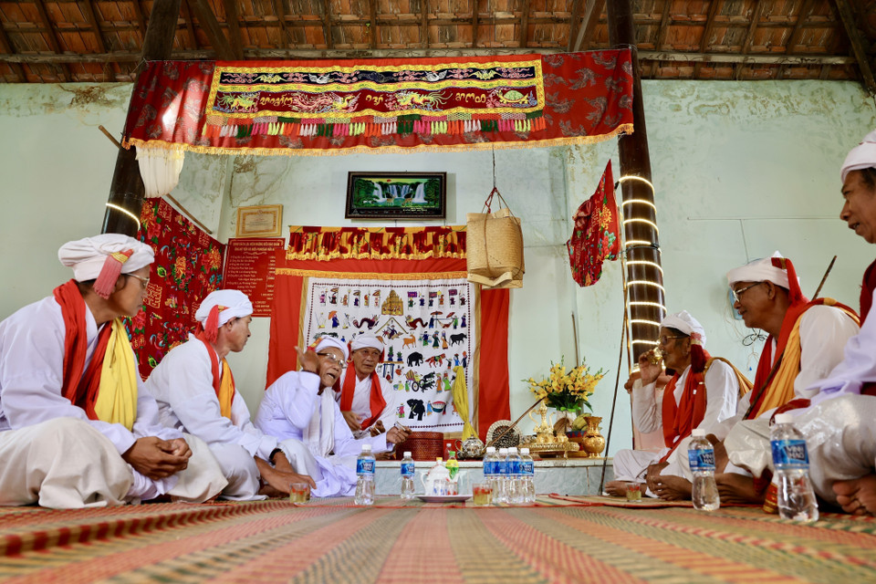Những chức sắc Po Adhia, ông Kadhar, bà Pajau, ông Camanei cùng với các bô lão, phụ nữ, người có uy tín trong làng chờ đến giờ đi đón y chang. (Ảnh: Nhật Anh/TTXVN)