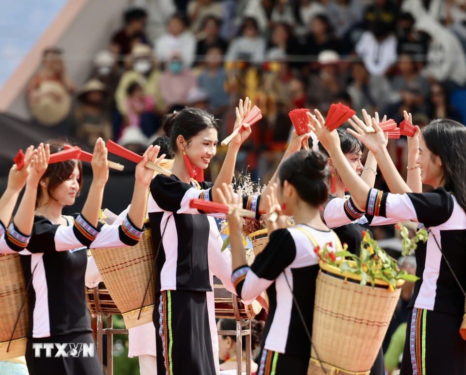 Thiếu nữ trong trang phục truyền thống biểu diễn những điệu múa tập thể hân hoan chào đón đoàn người Raglai trong lễ rước y trang. (Ảnh: Nhật Anh/TTXVN)