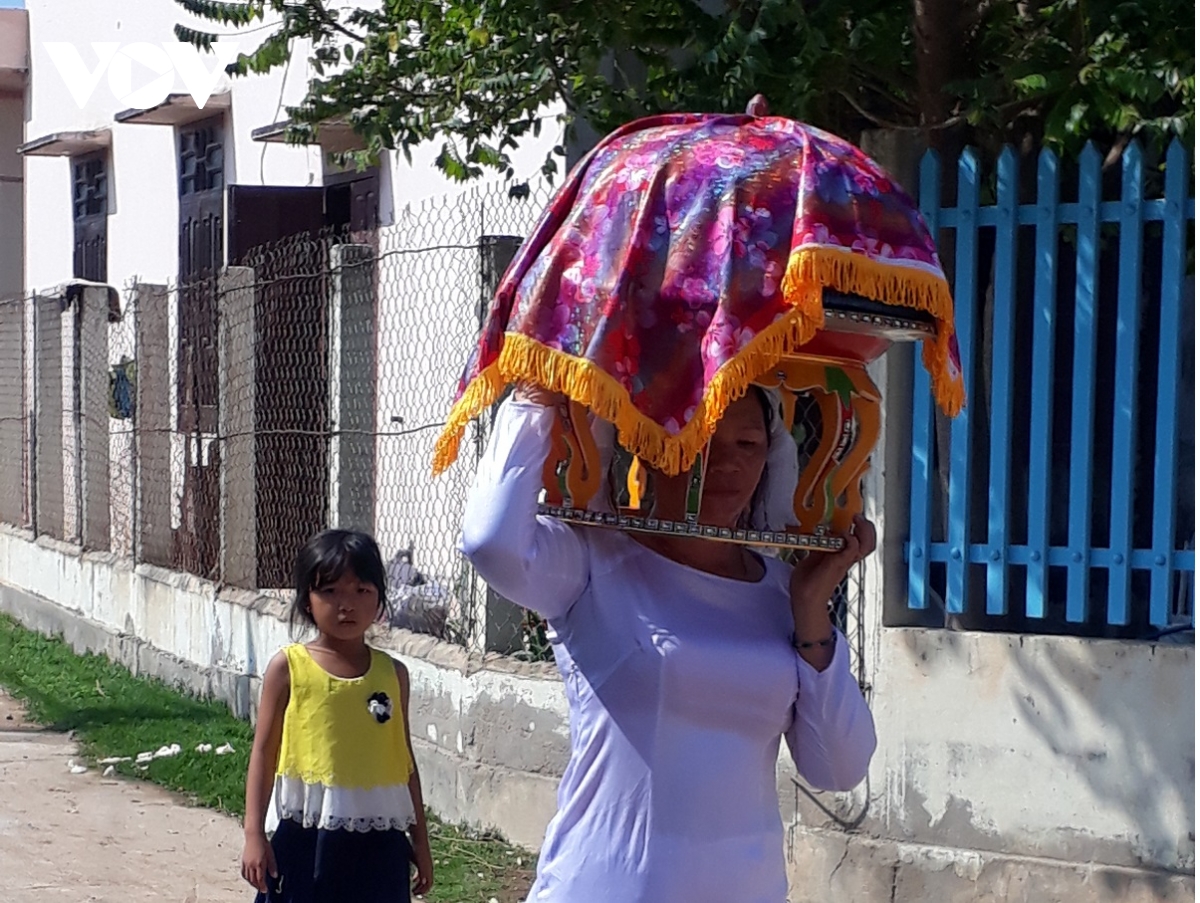 Trong những ngày này không khí tại làng Chăm thôn Bình Hòa, xã Bắc Bình, tỉnh Lâm Đồng rộn ràng hẳn lên. Sau 3 nhịp trống vang lên từ thánh đường (Sang Megik) cũng là lúc các thiếu nữ Chăm đội mâm lễ vào thánh đường.