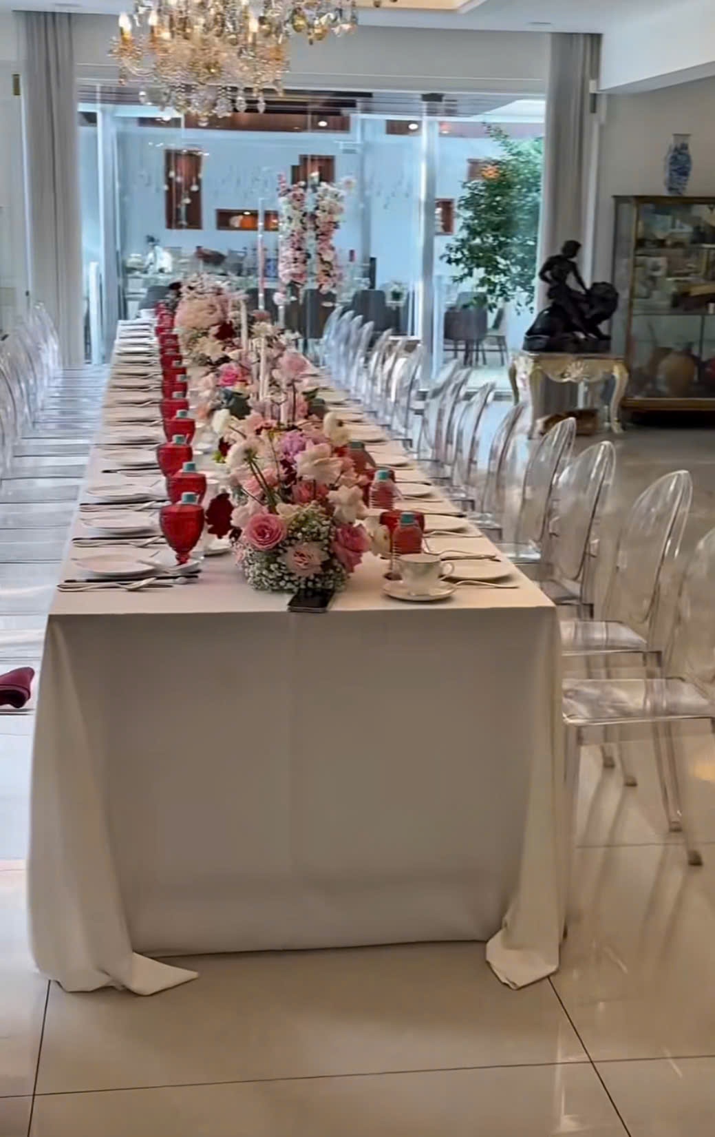 Phòng tiệc chính được sắp đặt theo phong cách tối giản, hiện đại: bàn dài phủ khăn trắng, hai hàng ghế trong suốt khoảng 30 chỗ ngồi, điểm nhấn là những cụm hoa tươi đồng điệu màu sắc và bộ ly pha lê đỏ nổi bật.