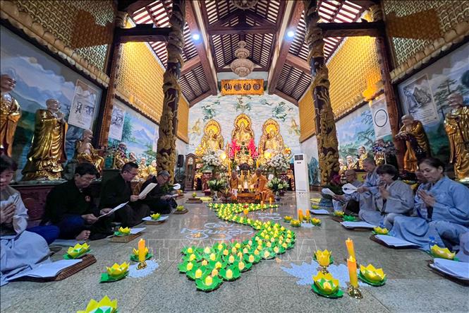 Trong không khí trang nghiêm, đông đảo tăng ni, Phật tử đã cùng nhau tụng kinh, thắp những ngọn hoa đăng, gửi gắm lời cầu chúc bình an và chia sẻ sâu sắc với những mất mát của đồng bào nơi quê hương.