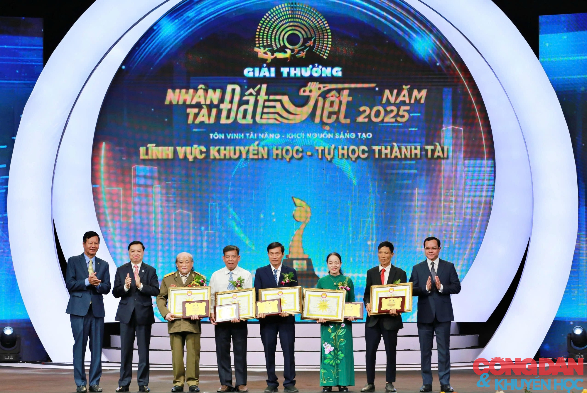 Ban tổ chức Giải thưởng Nhân tài Đất Việt trao giải "Khuyến học - Tự học thành tài" cho các tác giả.
