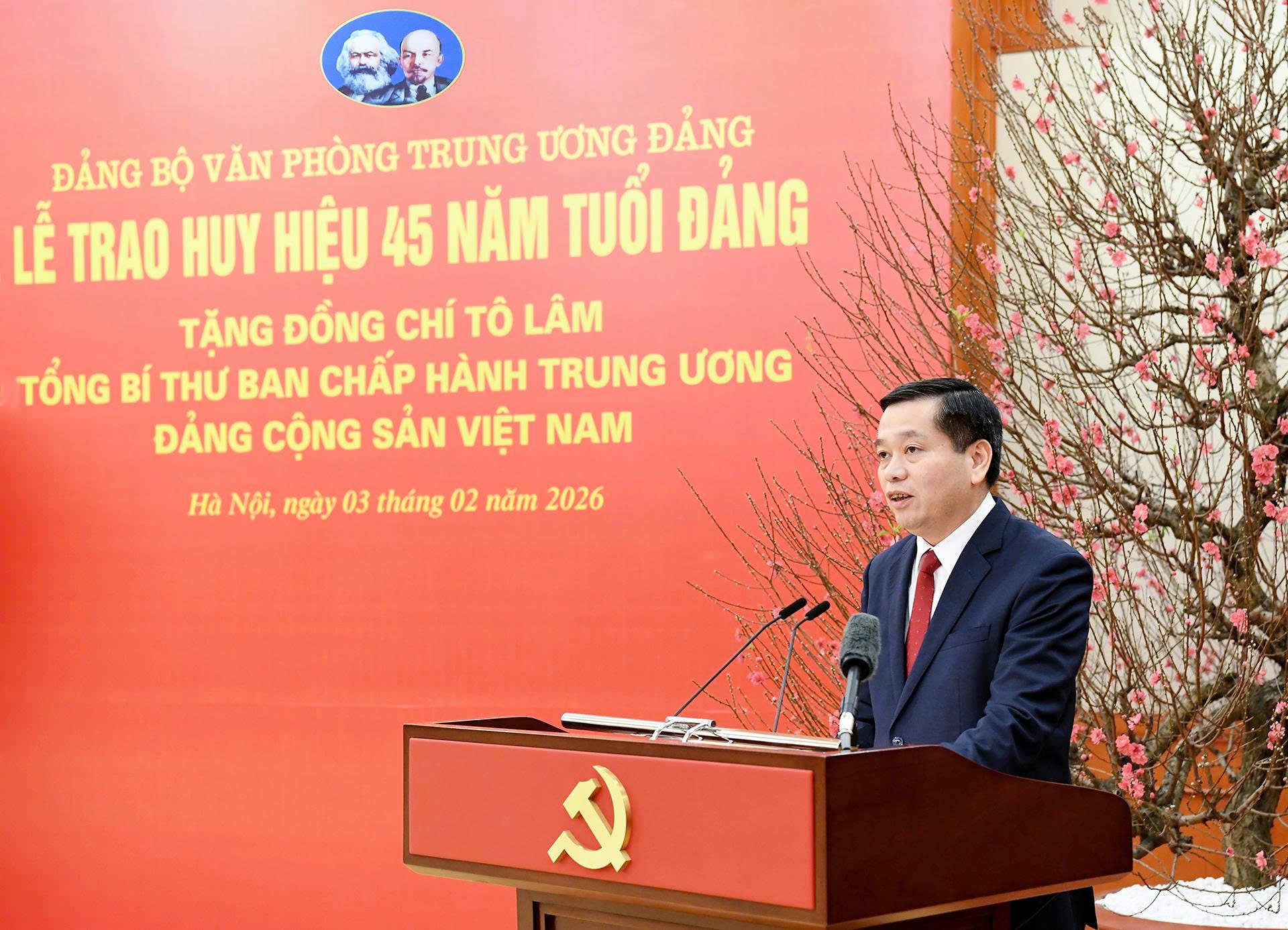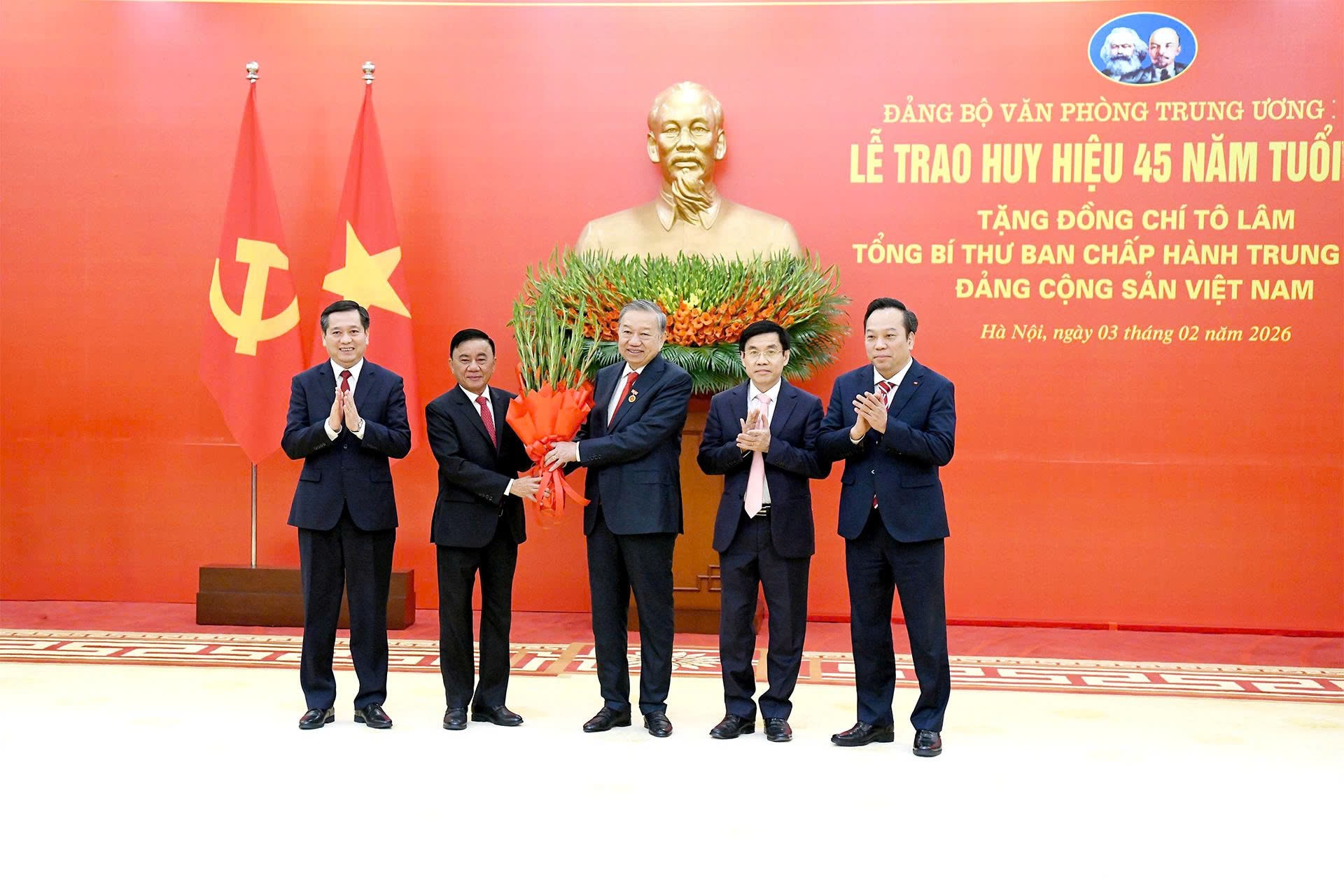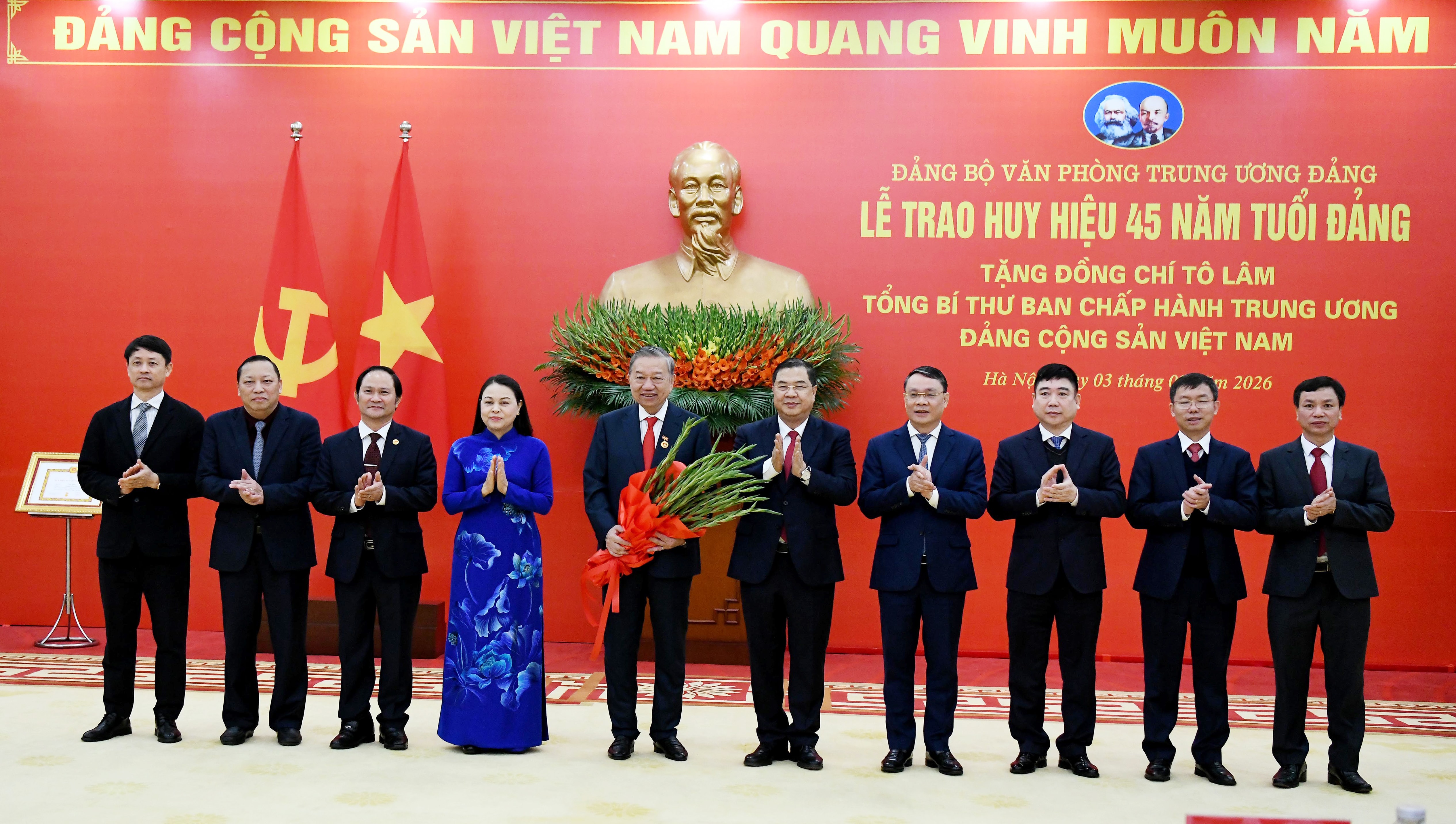 Tại buổi lễ, thay mặt Lãnh đạo Đảng và Nhà nước, Thường trực Ban Bí thư Trần Cẩm Tú đã trao Huy hiệu 45 năm tuổi Đảng và tặng hoa chúc mừng Tổng Bí thư Tô Lâm.