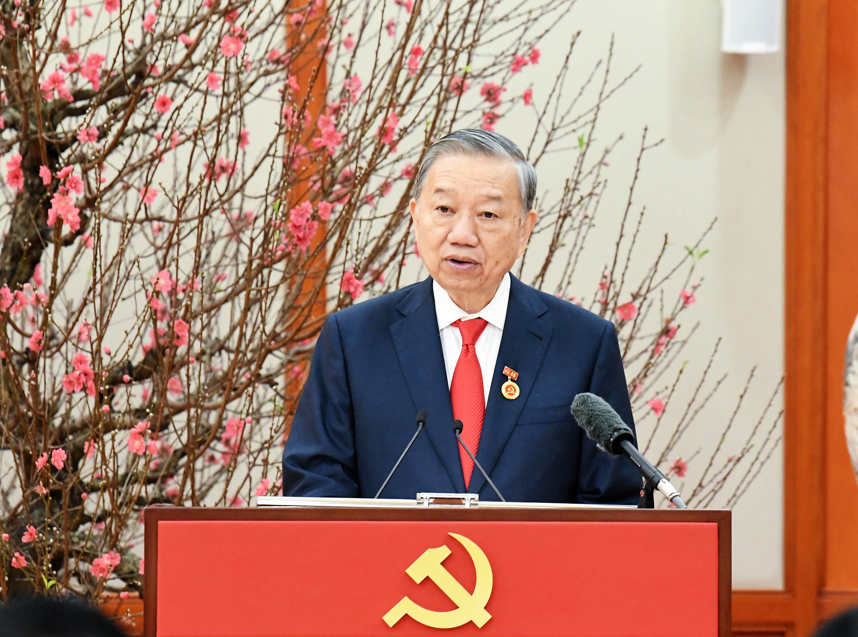 Phát biểu tại buổi lễ, Thường trực Ban Bí thư Trần Cẩm Tú nhiệt liệt chúc mừng Tổng Bí thư Tô Lâm được trao tặng Huy hiệu 45 năm tuổi Đảng đúng vào dịp kỷ niệm 96 năm thành lập Đảng Cộng sản Việt Nam quang vinh; nhấn mạnh, đây là sự kiện có ý nghĩa đặc biệt, ghi nhận chặng đường gần nửa thế kỷ phấn đấu, rèn luyện, cống hiến không mệt mỏi của đồng chí Tổng Bí thư cho sự nghiệp cách mạng của Đảng và dân tộc.