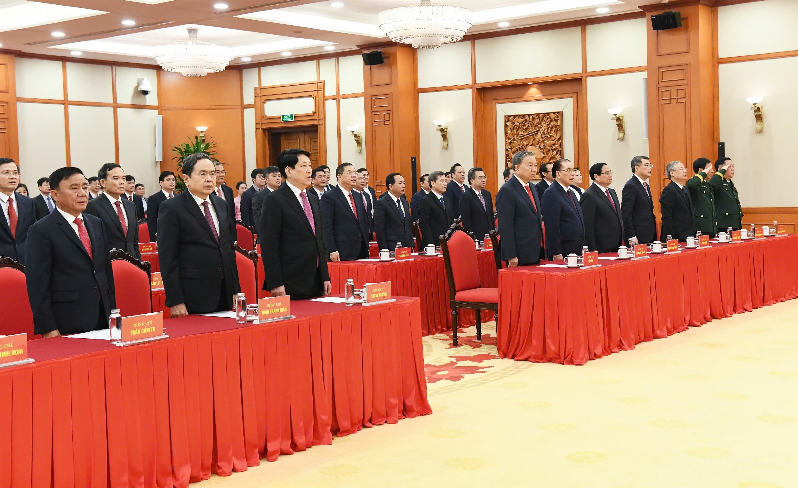 Tại buổi lễ, nguyên Tổng Bí thư Nông Đức Mạnh; Chủ tịch nước Lương Cường; Thủ tướng Chính phủ Phạm Minh Chính; Chủ tịch Quốc hội Trần Thanh Mẫn và các đồng chí tham dự đã tặng hoa chúc mừng Tổng Bí thư Tô Lâm.