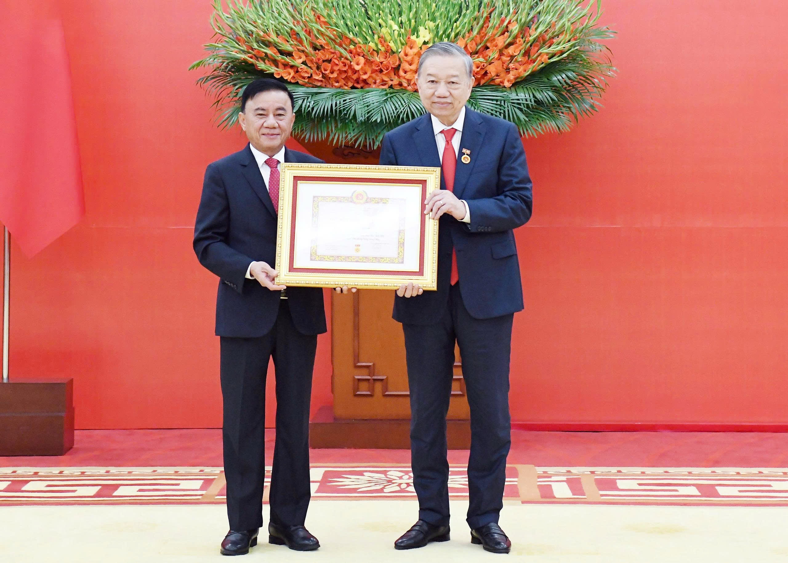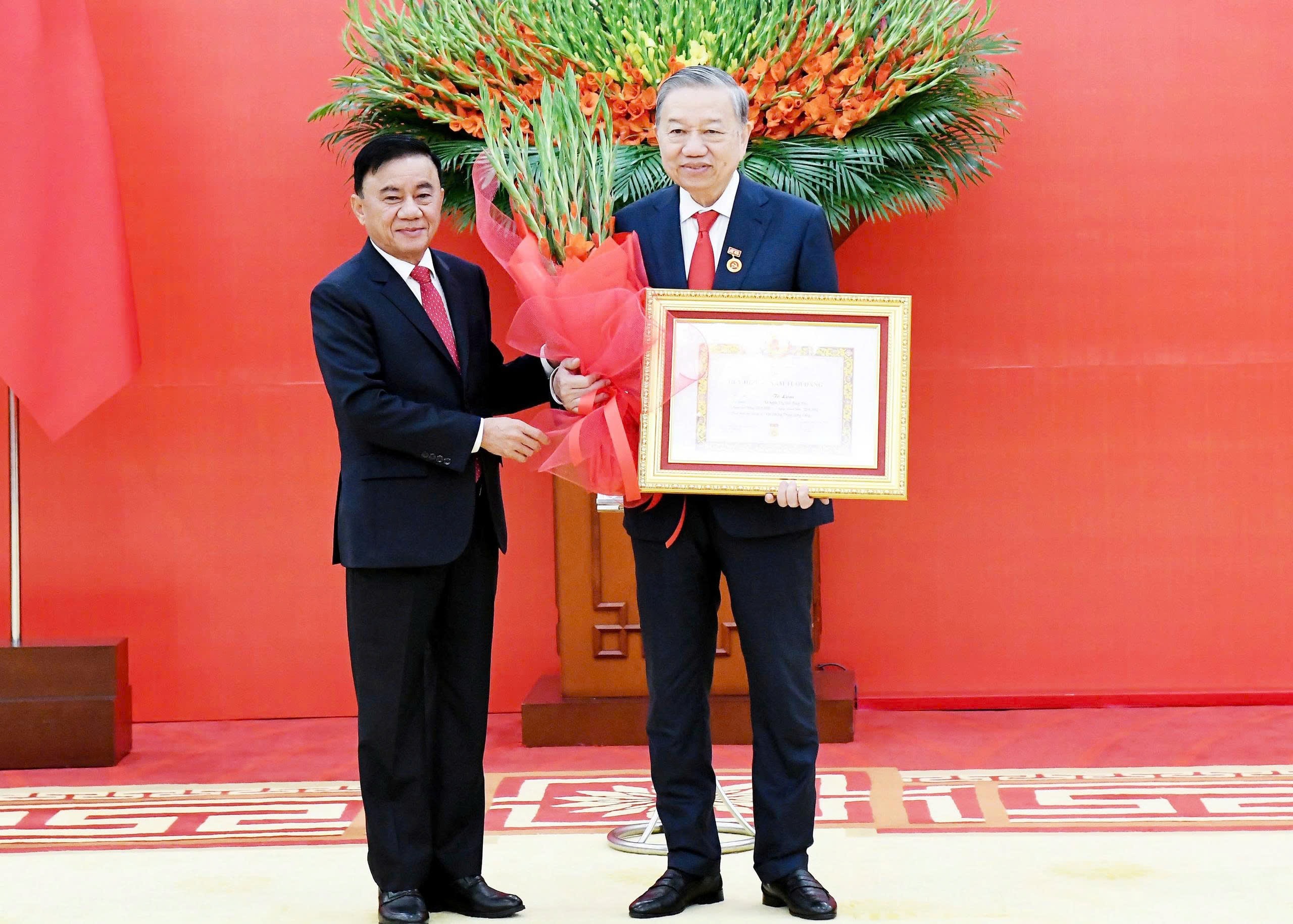 Thường trực Ban Bí thư Trần Cẩm Tú trao huy hiệu 45 năm tuổi Đảng tặng Tổng Bí thư Tô Lâm. Ảnh: Lâm Hiển