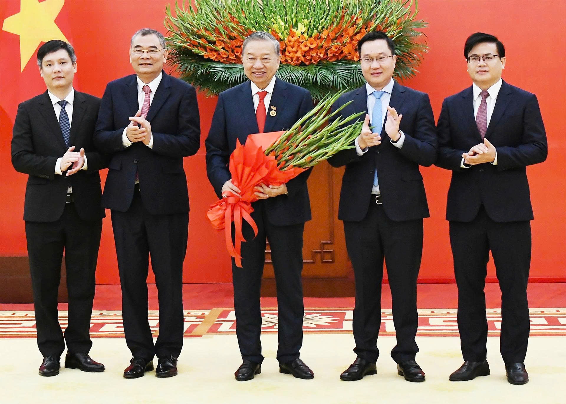 Các đồng chí Ủy viên Bộ Chính trị và Ban Bí thư tặng hoa chúc mừng Tổng Bí thư Tô Lâm