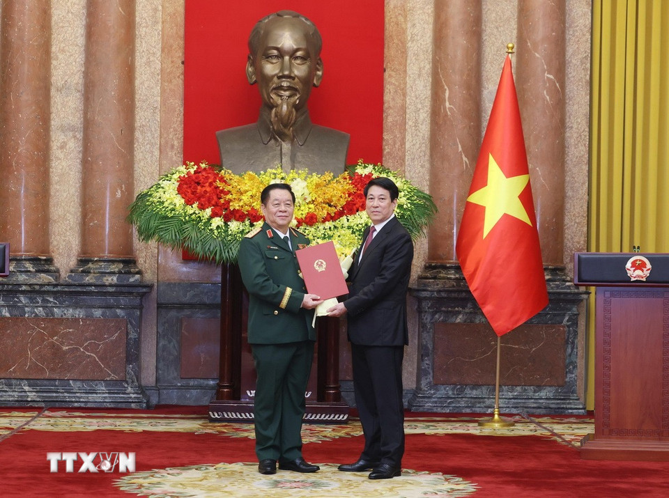 Chủ tịch nước Lương Cường trao Quyết định bổ nhiệm đồng chí Nguyễn Trọng Nghĩa giữ chức Chủ nhiệm Tổng cục Chính trị Quân đội nhân dân Việt Nam, đồng thời thăng quân hàm từ Thượng tướng lên Đại tướng. (Ảnh: Lâm Khánh/TTXVN)