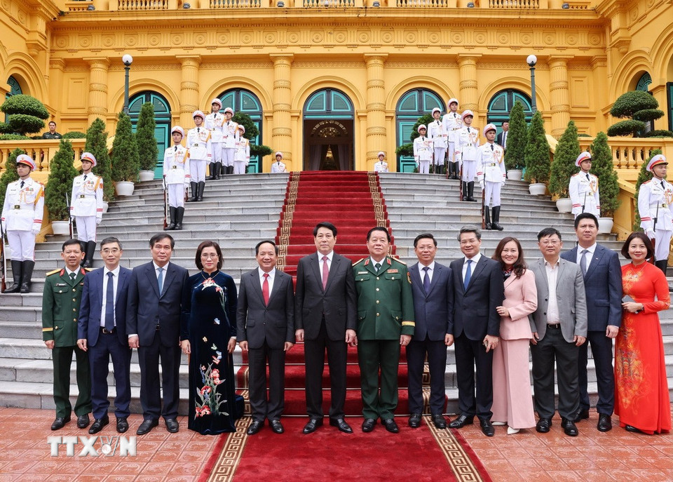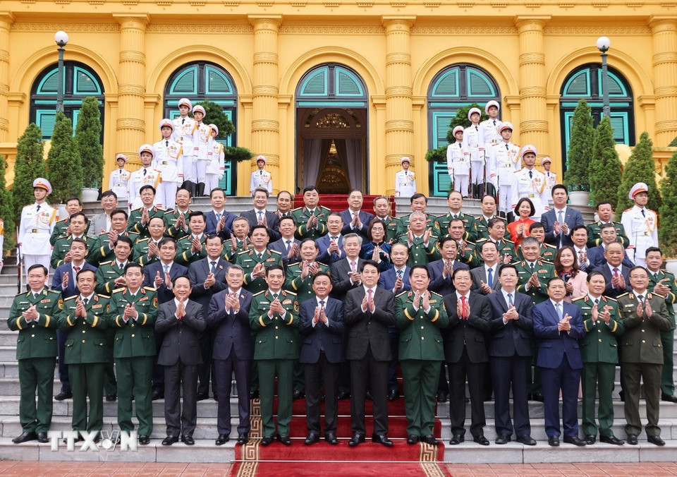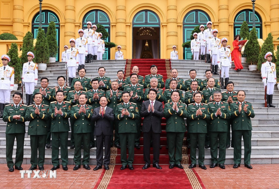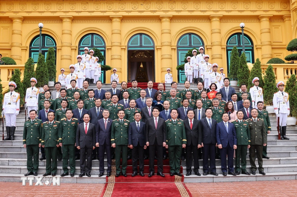 Chủ tịch nước Lương Cường với các đại biểu Bộ Quốc phòng. (Ảnh: Lâm Khánh/TTXVN)