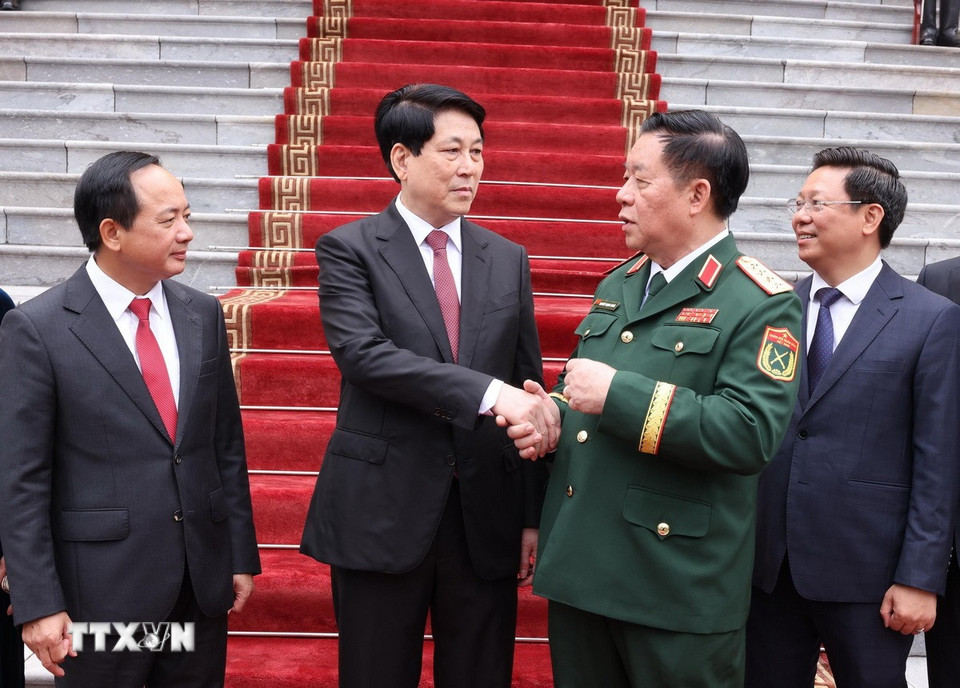 Chủ tịch nước Lương Cường với Lãnh đạo Ban Tuyên giáo và Dân vận Trung ương. (Ảnh: Lâm Khánh/TTXVN)