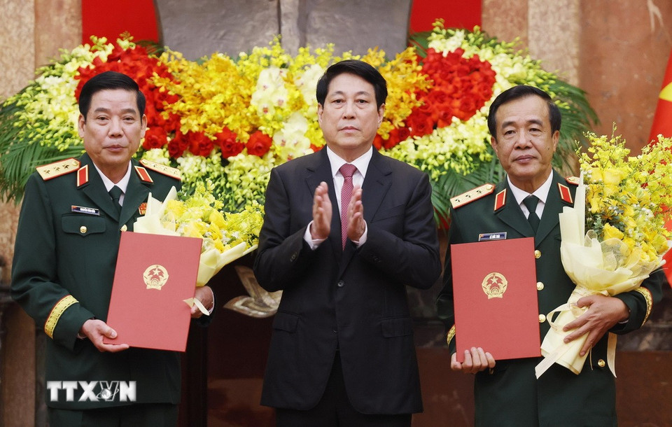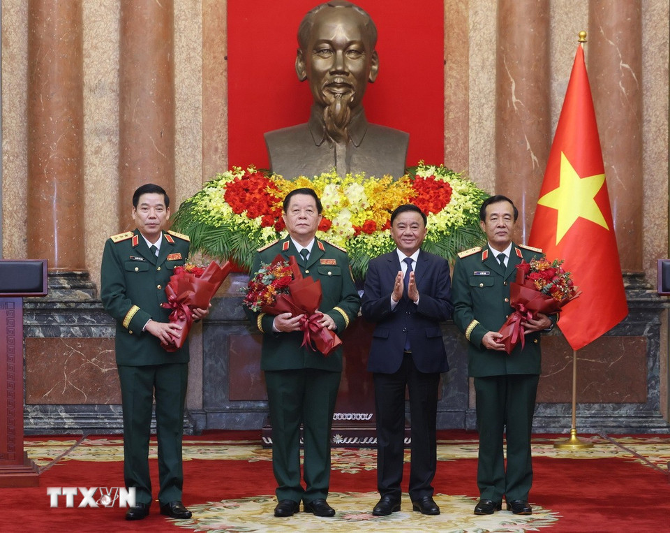 Chủ tịch nước Lương Cường trao Quyết định thăng quân hàm từ Trung tướng lên Thượng tướng đối với hai Ủ viên Trung ương Đảng, Thứ trưởng Bộ Quốc phòng Nguyễn Văn Gấu và Lê Đức Thái. (Ảnh: Lâm Khánh/TTXVN)
