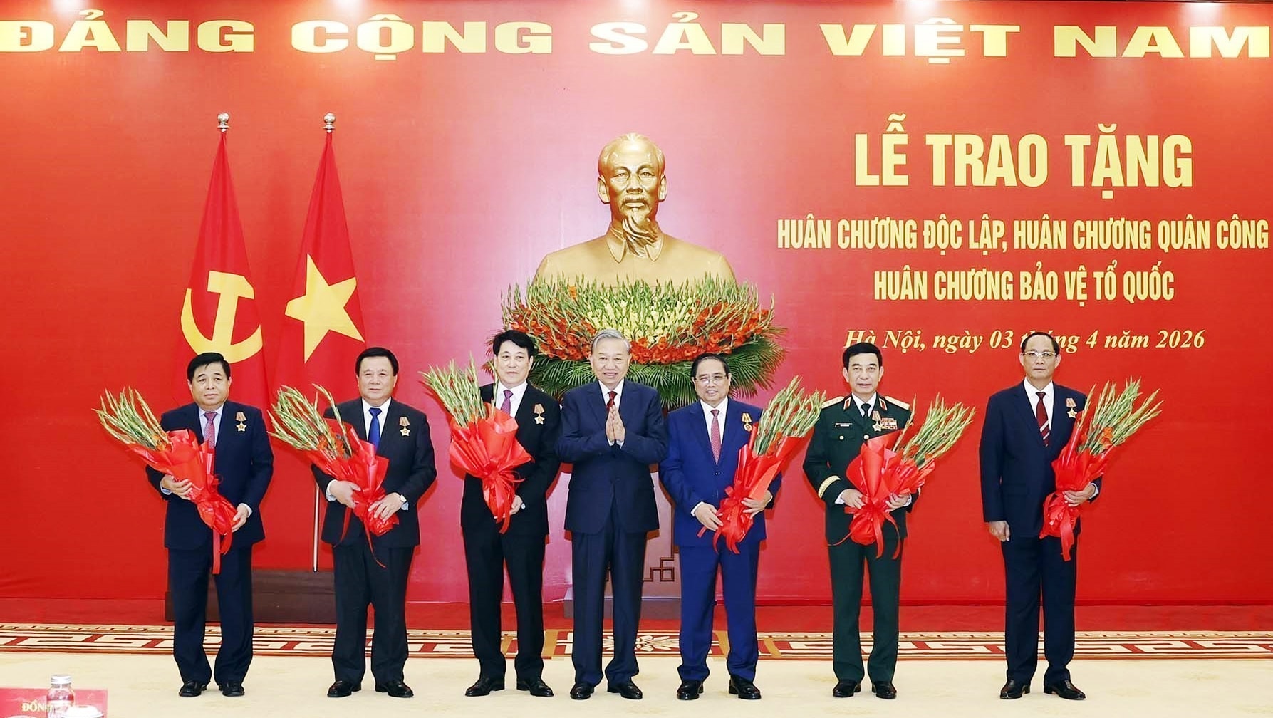 Tổng Bí thư Tô Lâm trao tặng Huân chương Độc lập hạng Nhất cho Thủ tướng Phạm Minh Chính và Huân chương Quân công hạng Nhất cho các đồng chí: Chủ tịch nước, Đại tướng Lương Cường; Bộ trưởng Bộ Quốc phòng, Đại tướng Phan Văn Giang; nguyên Giám đốc Học viện Chính trị quốc gia Hồ Chí Minh, Chủ tịch Hội đồng Lý luận Trung ương Nguyễn Xuân Thắng; Phó Chủ tịch Quốc hội, Thượng tướng Trần Quang Phương; Phó Thủ tướng Chính phủ Nguyễn Chí Dũng. Ảnh: Thống Nhất/TTXVN