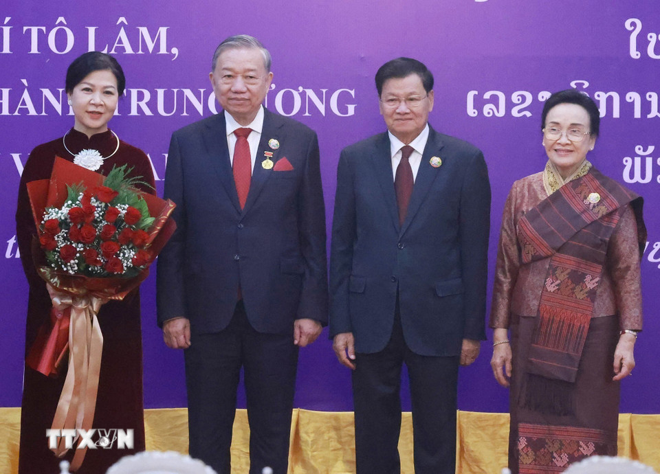 Tổng Bí thư Tô Lâm và Phu nhân cùng Tổng Bí thư, Chủ tịch nước Lào Thongloun Sisoulith và Phu nhân tại buổi lễ. (Ảnh: Thống Nhất/TTXVN)