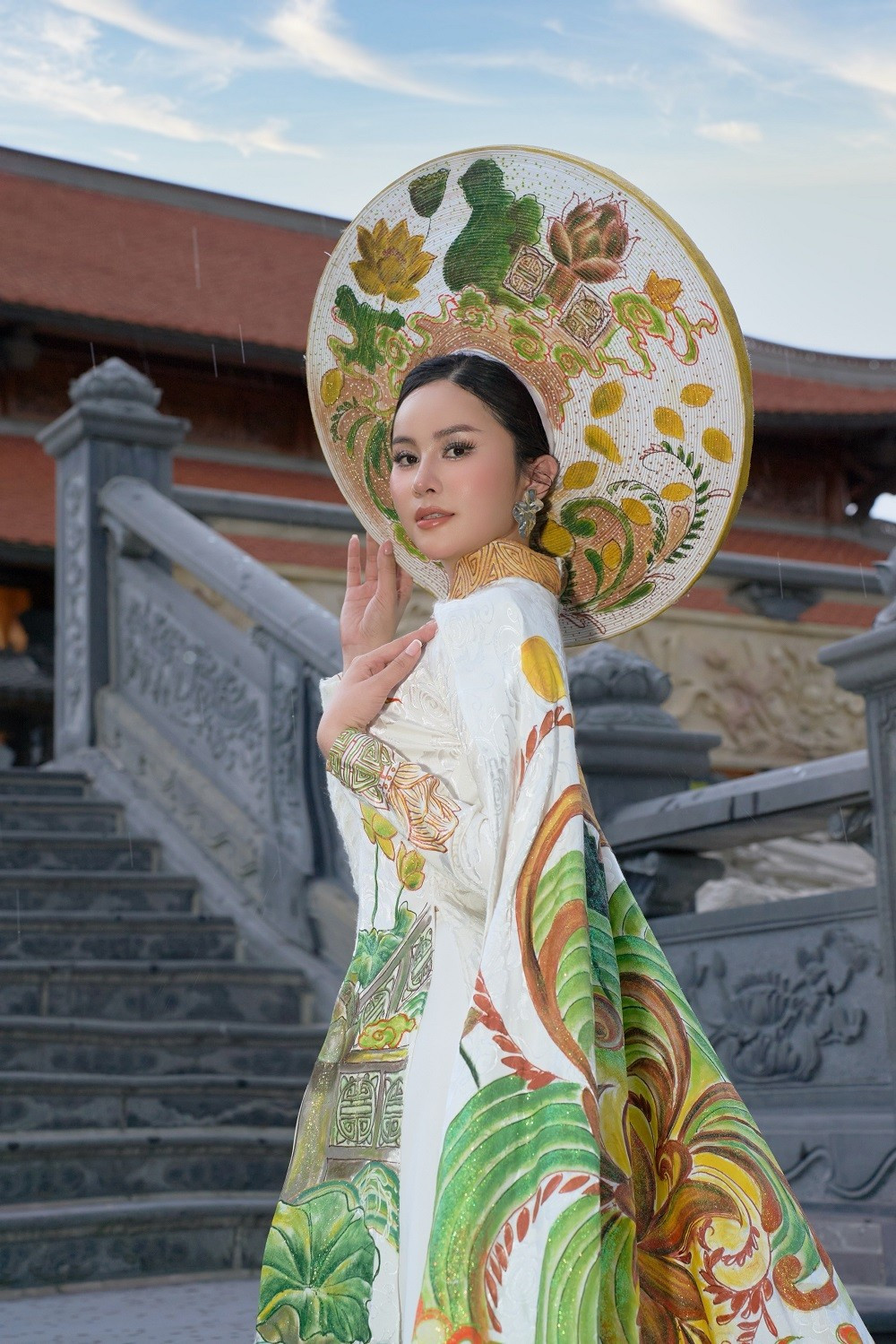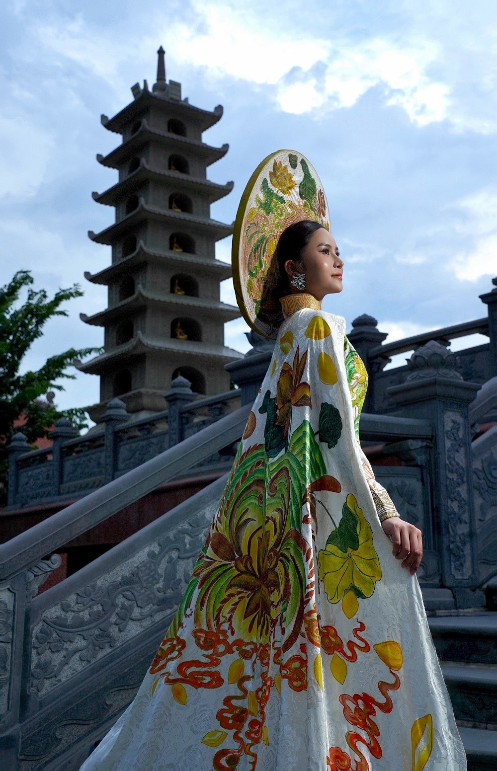 Chiếc áo dài Trắng – Sen Việt mở đầu cho bộ sưu tập. Trên nền gấm trắng ngà, họa tiết sen vàng và lá xanh được vẽ tay tỉ mỉ, thể hiện triết lý “sen mọc giữa bùn mà vẫn tỏa hương”. Chiếc mấn rộng cùng họa tiết sen tiếp nối trên nón lá, tạo nên sự đồng điệu tuyệt mỹ giữa con người và thiên nhiên.