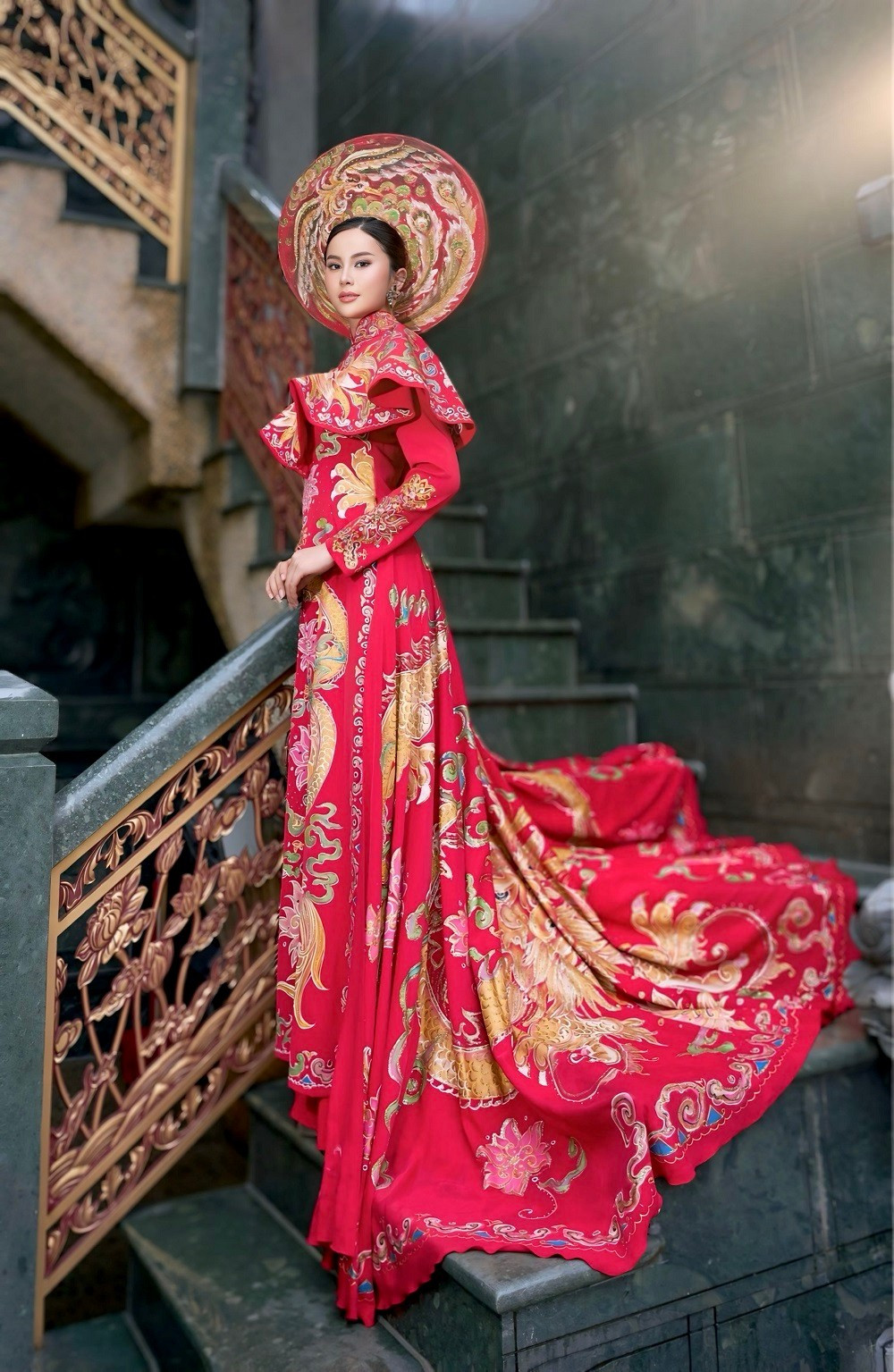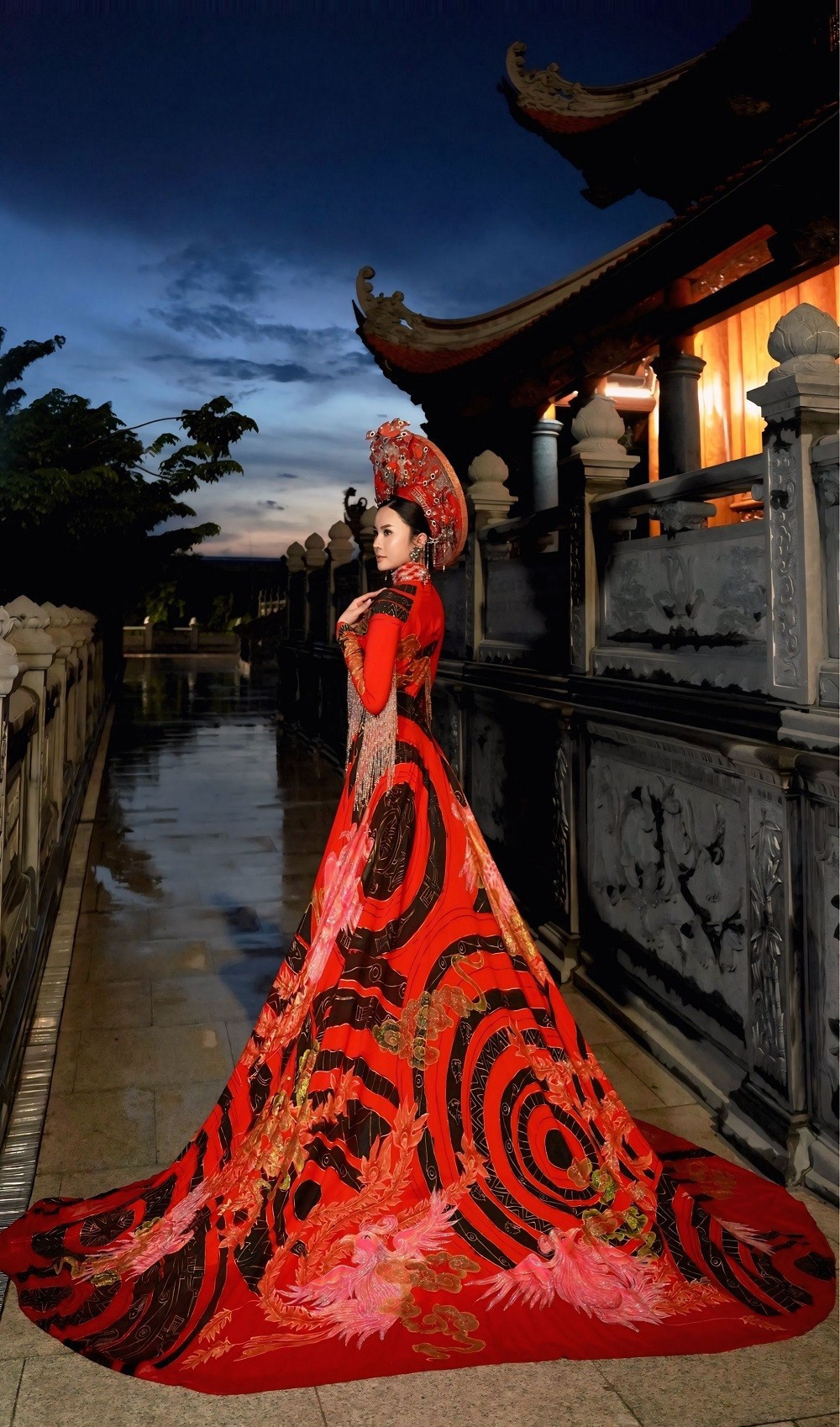 Phần tà áo phủ dài hơn ba mét được thiết kế để khi bước đi, hình ảnh phượng hoàng như sống dậy, vỗ cánh trong ánh hoàng hôn khép lại. Đây không chỉ là một trang phục, mà là một nghi lễ thị giác của quyền năng và nữ tính.