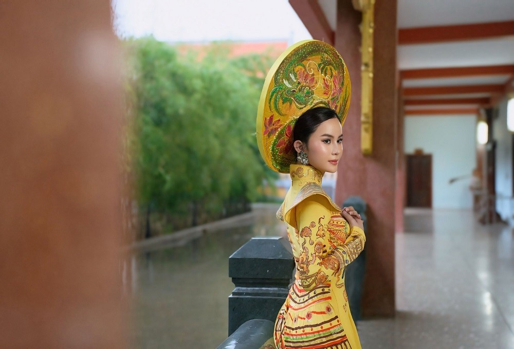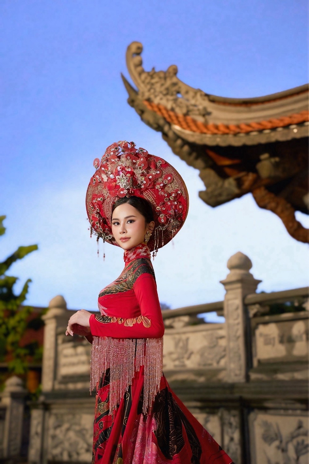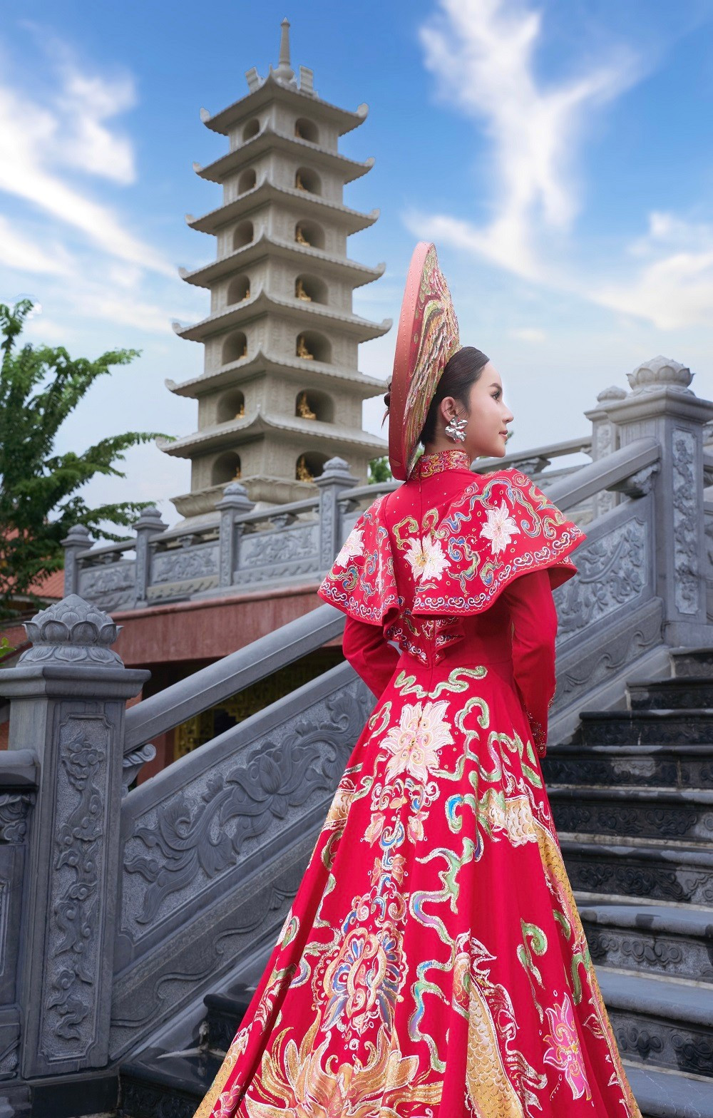Trong không gian chùa cổ, thiết kế Vàng – Thiên Long như tỏa rực cả khung cảnh. Hình rồng uốn lượn trên nền gấm vàng thêu chỉ xanh lam và đỏ son, kết hợp cùng chiếc mấn vẽ tay tinh tế, gợi lên hình ảnh “Long ẩn vân” – biểu trưng cho phú quý, vươn mình bay cao.