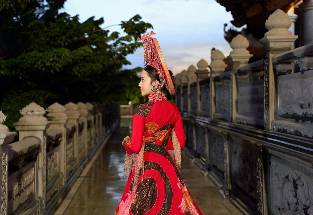 Tiếp nối là mẫu Đỏ – Phụng Hoàng, chiếc áo dài mang sắc đỏ mẫu nghi, vương giả hòa cùng họa tiết đôi loan phượng tung cánh trên phông nền Đông Sơn. Những họa tiết đồng tâm mô phỏng trống đồng cổ được đính kết ánh kim tinh xảo, gợi liên tưởng đến sức mạnh tái sinh và niềm kiêu hãnh nữ quyền.
