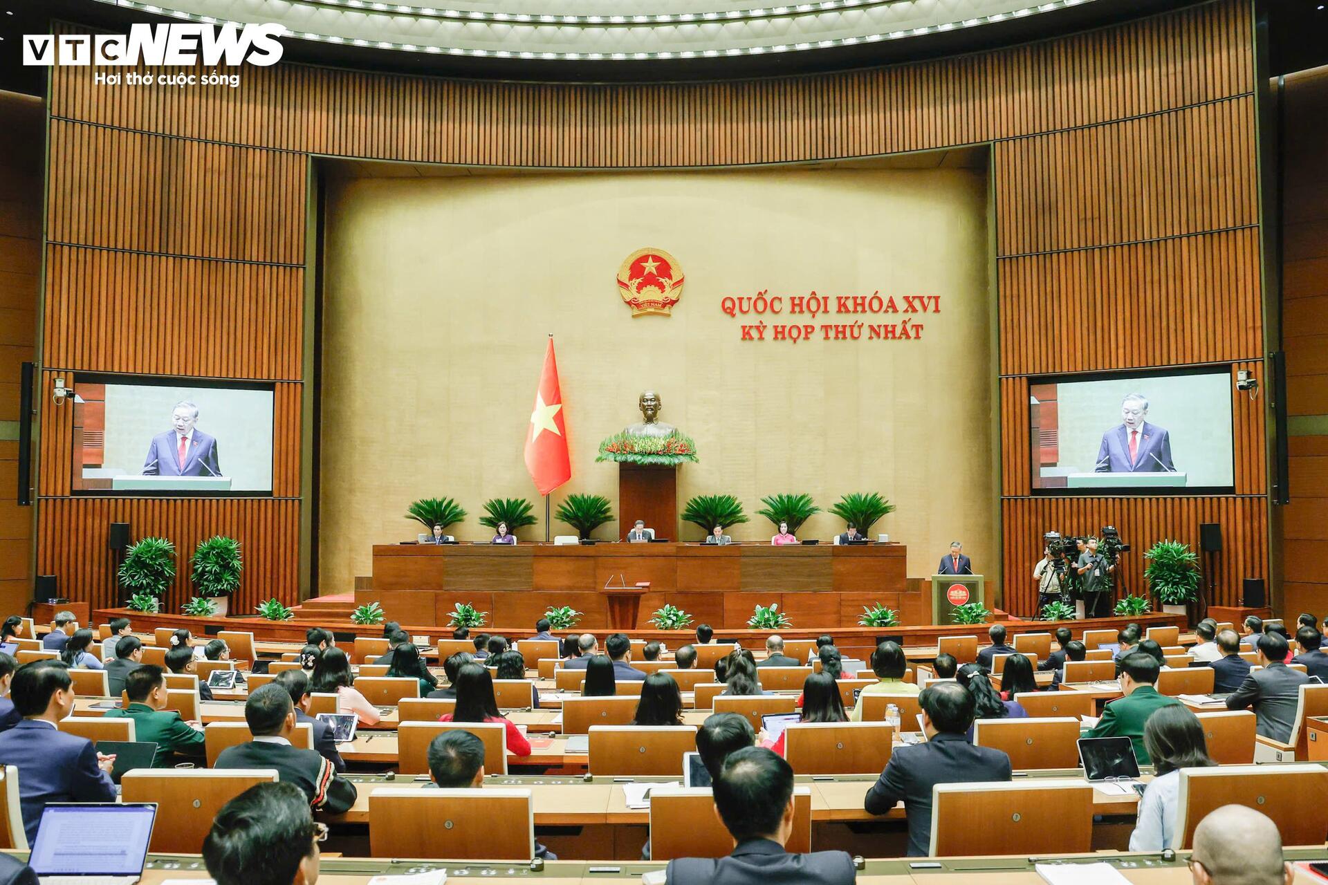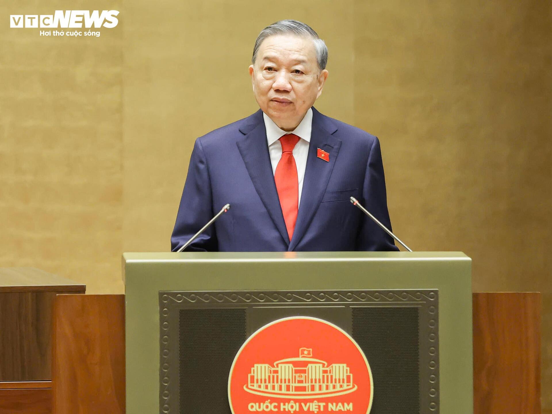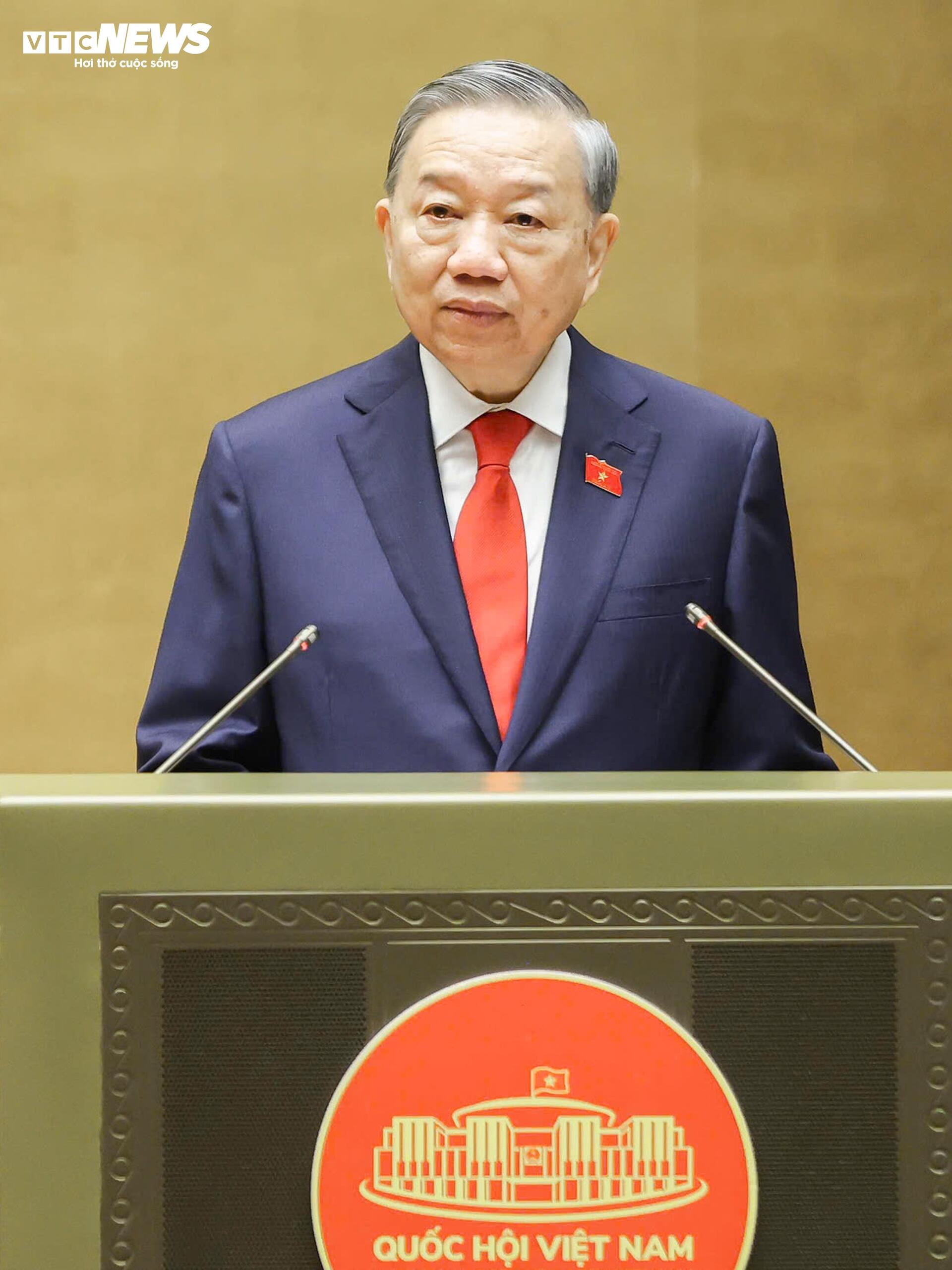 "Dưới cờ đỏ sao vàng thiêng liêng của Tổ quốc, trước Quốc hội, đồng bào và cử tri, tôi, Chủ tịch nước Cộng hòa xã hội chủ nghĩa Việt Nam xin tuyên thệ: Tuyệt đối trung thành với Tổ quốc, với Nhân dân, với Hiến pháp nước Cộng hòa xã hội chủ nghĩa Việt Nam, nỗ lực phấn đấu, hoàn thành tốt mọi nhiệm vụ mà Đảng, Nhà nước và Nhân dân giao phó", Chủ tịch nước Tô Lâm tuyên thệ.
