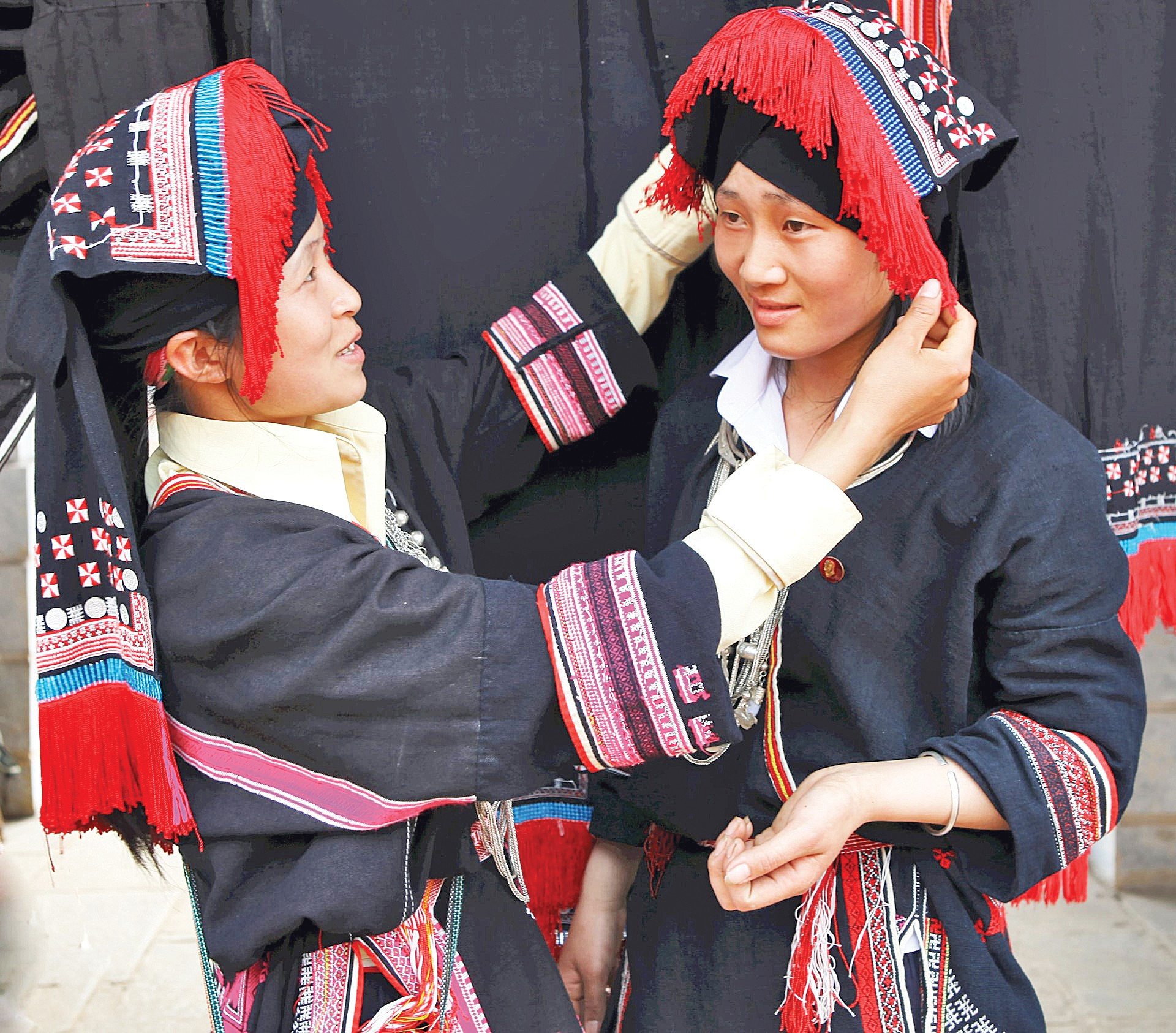 Sương sớm chưa tan, ông mặt trời còn ngủ, người dân trong xã đã kéo về khu trung tâm Ủy ban nhân dân xã, trang phục rực mầu đỏ. Bà con mang theo thức ăn, nước uống. Các cô gái Dao mặc những bộ váy áo mới viền hoa văn mầu đỏ cầm tay nhau chạy, nhảy làm cho những quả cầu bông đỏ trên ngực lắc lư theo.