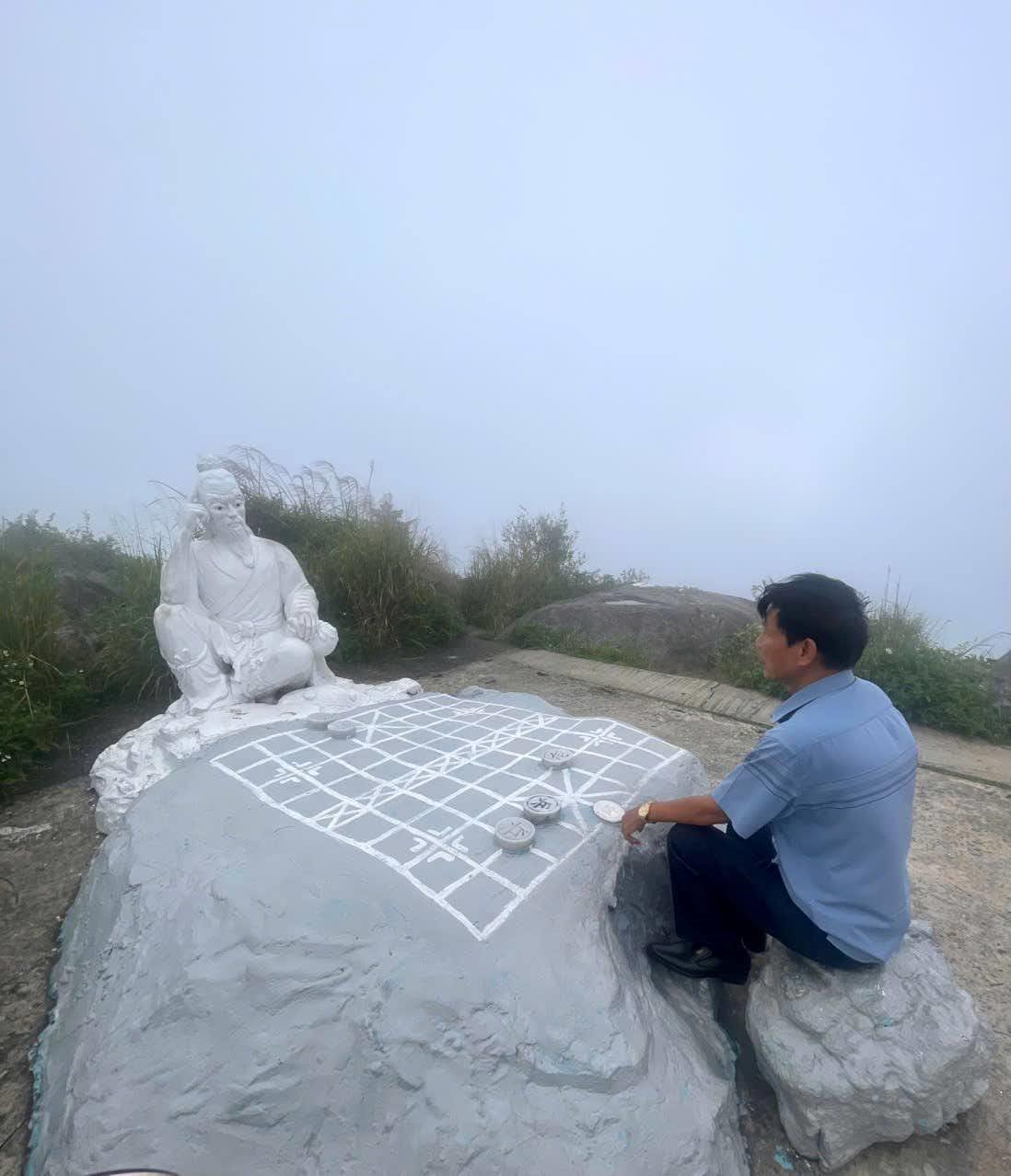 Tác giả ngồi trước bàn cờ của Đế Thích trên đỉnh Bàn Cờ.