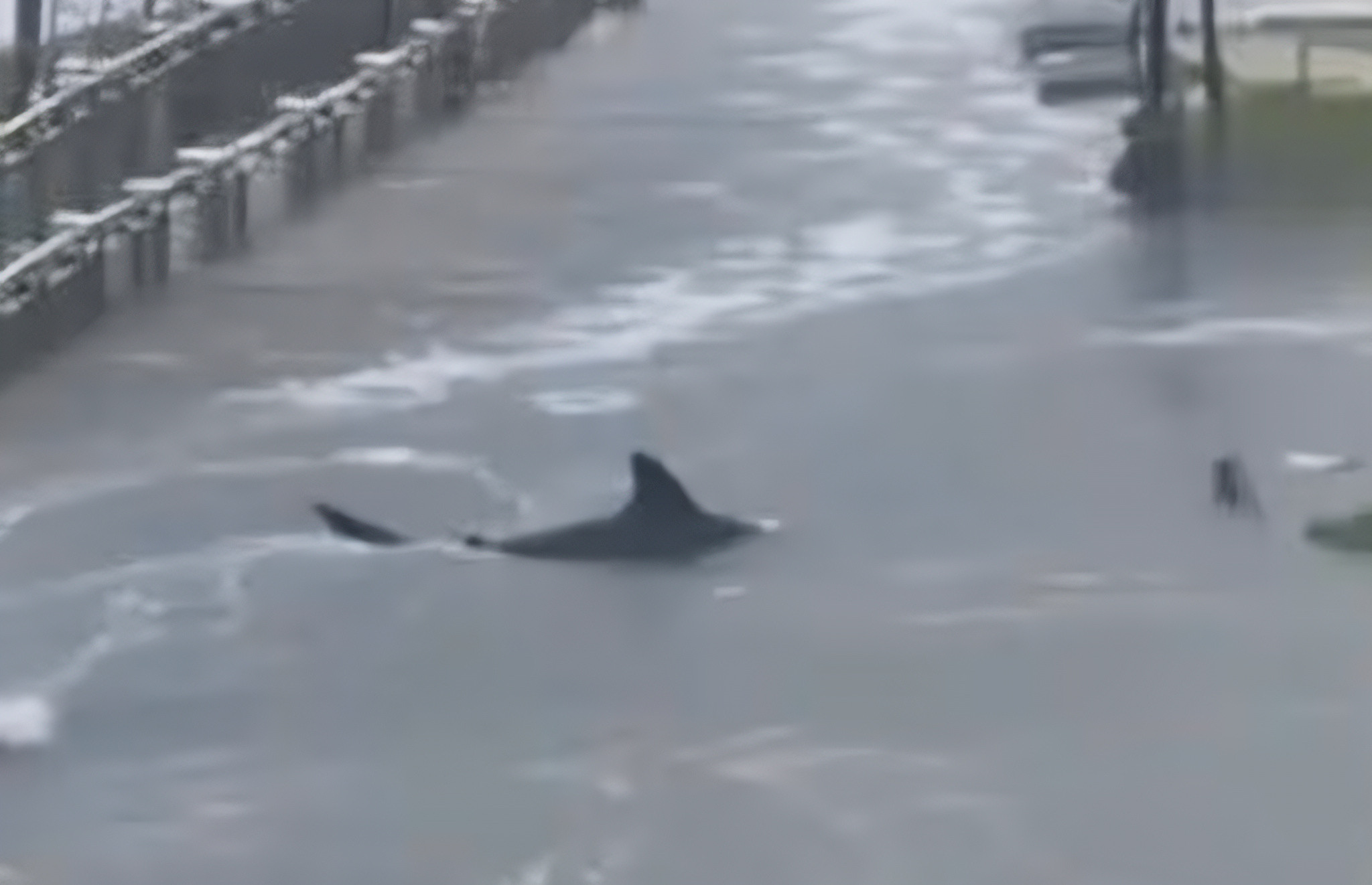 Cảnh tượng cá mập xuất hiện giữa khu đô thị ngập nước - một hình ảnh giả mạo do AI tạo ra trong loạt video về bão Melissa lan truyền trên mạng xã hội. (Nguồn: TikTok)
