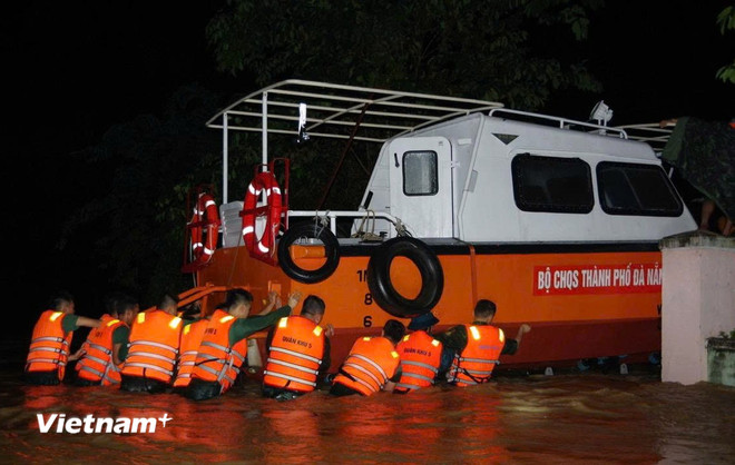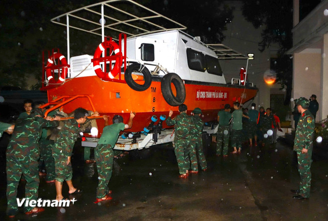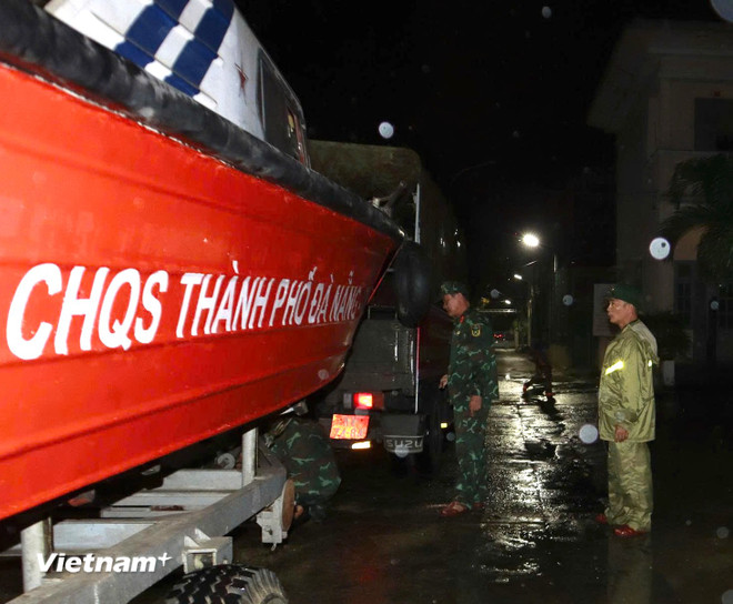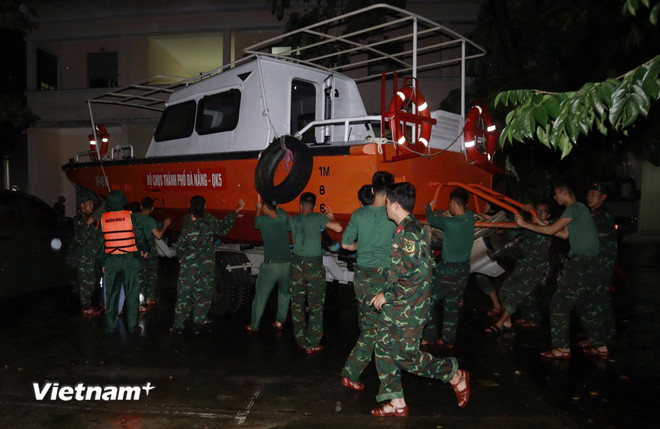 Gần 1h sáng ngày 30/10, Đại tá Trần Hữu Ích – Chỉ huy trưởng Bộ Chỉ huy Quân sự thành phố Đà Nẵng ban hành lệnh khẩn cấp điều động lực lượng cơ động cứu dân trong đêm. (Ảnh: PV/Vietnam+)