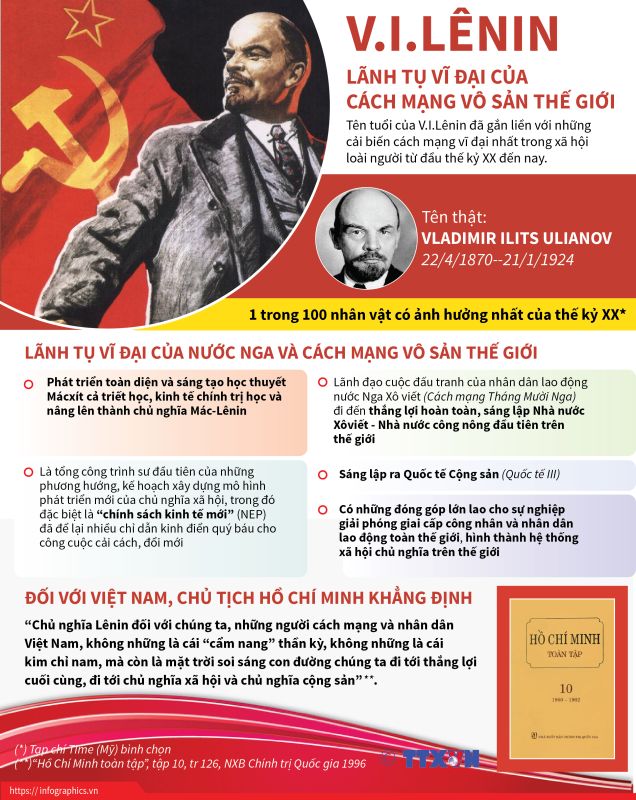 V.I.Lênin là nhà tư tưởng vĩ đại, lãnh tụ thiên tài của giai cấp công nhân, nhân dân lao động và các dân tộc bị áp bức trên toàn thế giới, người kế tục xuất sắc sự nghiệp giải phóng con người của Các - Mác, Ph. Ăng-ghen, người lãnh đạo thành công Cách mạng Tháng Mười Nga vĩ đại, mở ra thời đại mới của nhân loại - thời đại quá độ từ chủ nghĩa tư bản lên chủ nghĩa xã hội.