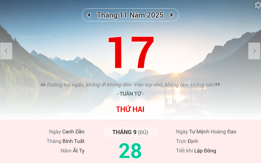 Âm lịch: Ngày 28/9/2025 Tức ngày Canh Dần, tháng Bính Tuất, năm Ất Tỵ.