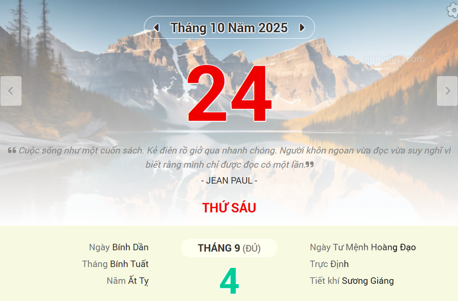 Âm lịch: Ngày 4/9/2025 Tức ngày Bính Dần, tháng Bính Tuất, năm Ất Tỵ.