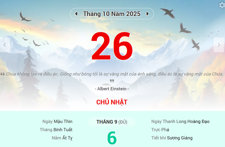 Âm lịch: Ngày 6/9/2025 Tức ngày Mậu Thìn, tháng Bính Tuất, năm Ất Tỵ.