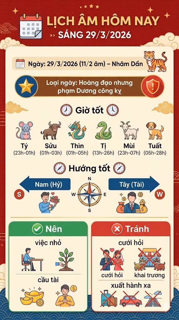 Ngày 29/3/2026 là ngày hoàng đạo nhưng không thực sự thuận lợi cho việc lớn do phạm Dương công kỵ và trực Bế. Người dân nên ưu tiên việc nhỏ, tránh khởi sự quan trọng hoặc xuất hành xa để hạn chế rủi ro.