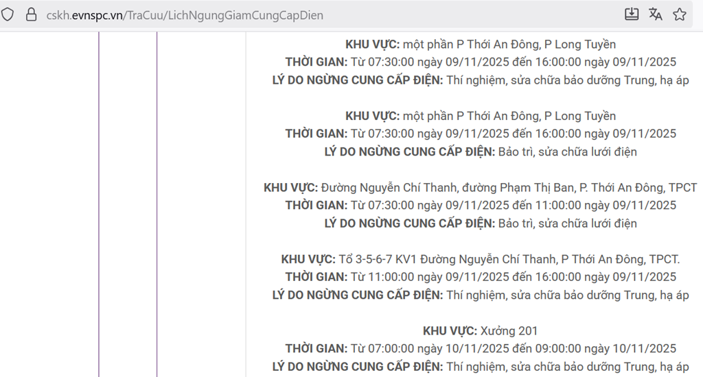 Chi tiết lịch cắt điện ngày mai 9/11 tại xã, phường Cần Thơ như sau: