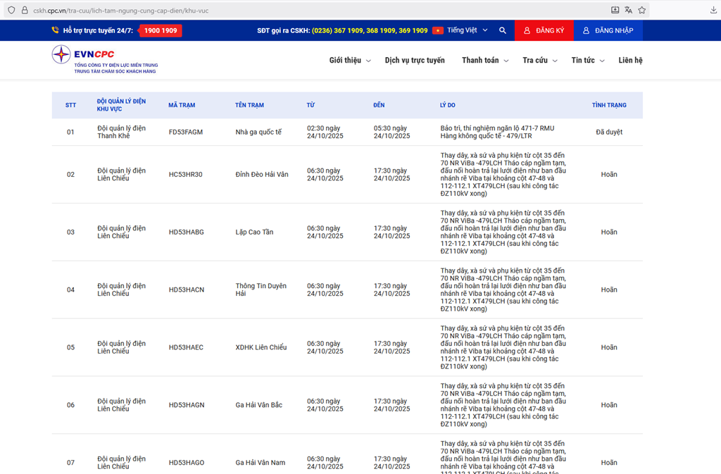 Công ty TNHH MTV Điện lực Đà Nẵng thông báo lịch tạm ngừng cung cấp điện, lịch cúp điện Đà Nẵng ngày mai 24/10 cập nhật mới nhất như sau: