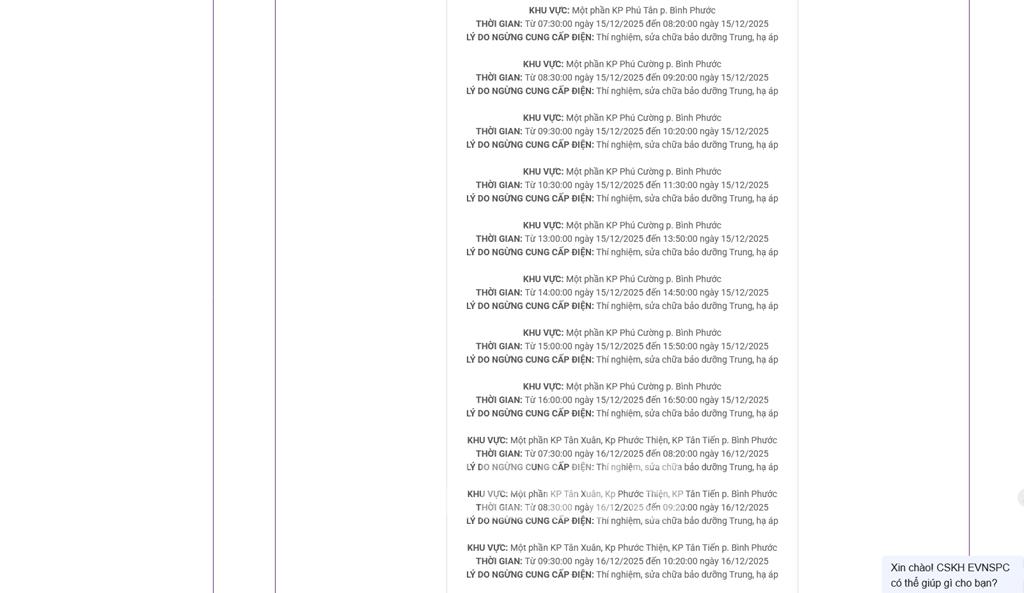 Lịch ngừng cấp điện tại Cần Thơ ngày mai 16/12 được cập nhật ngày 15/12 tại website của EVNSPC. Ảnh: BNEWS phát