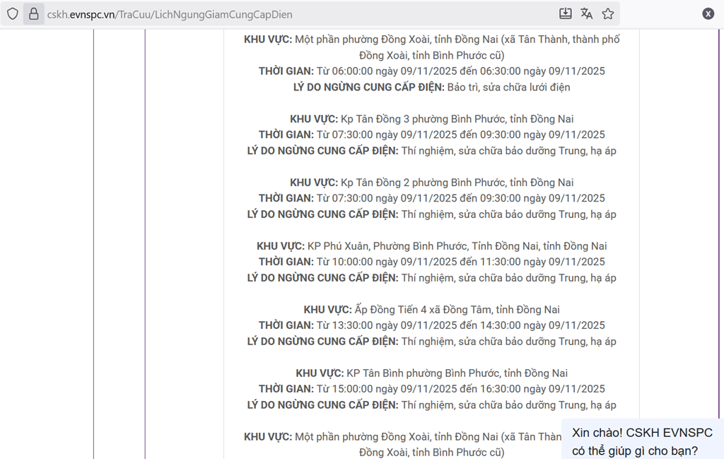 Lịch cắt điện cập nhật mới nhất tại Biên Hòa, lịch cắt điện tại Đồng Nai từ website của Tổng công ty Điện lực miền Nam (EVNSPC), Công ty TNHH MTV Điện lực Đồng Nai vào ngày mai 9/11 có lịch cắt điện.