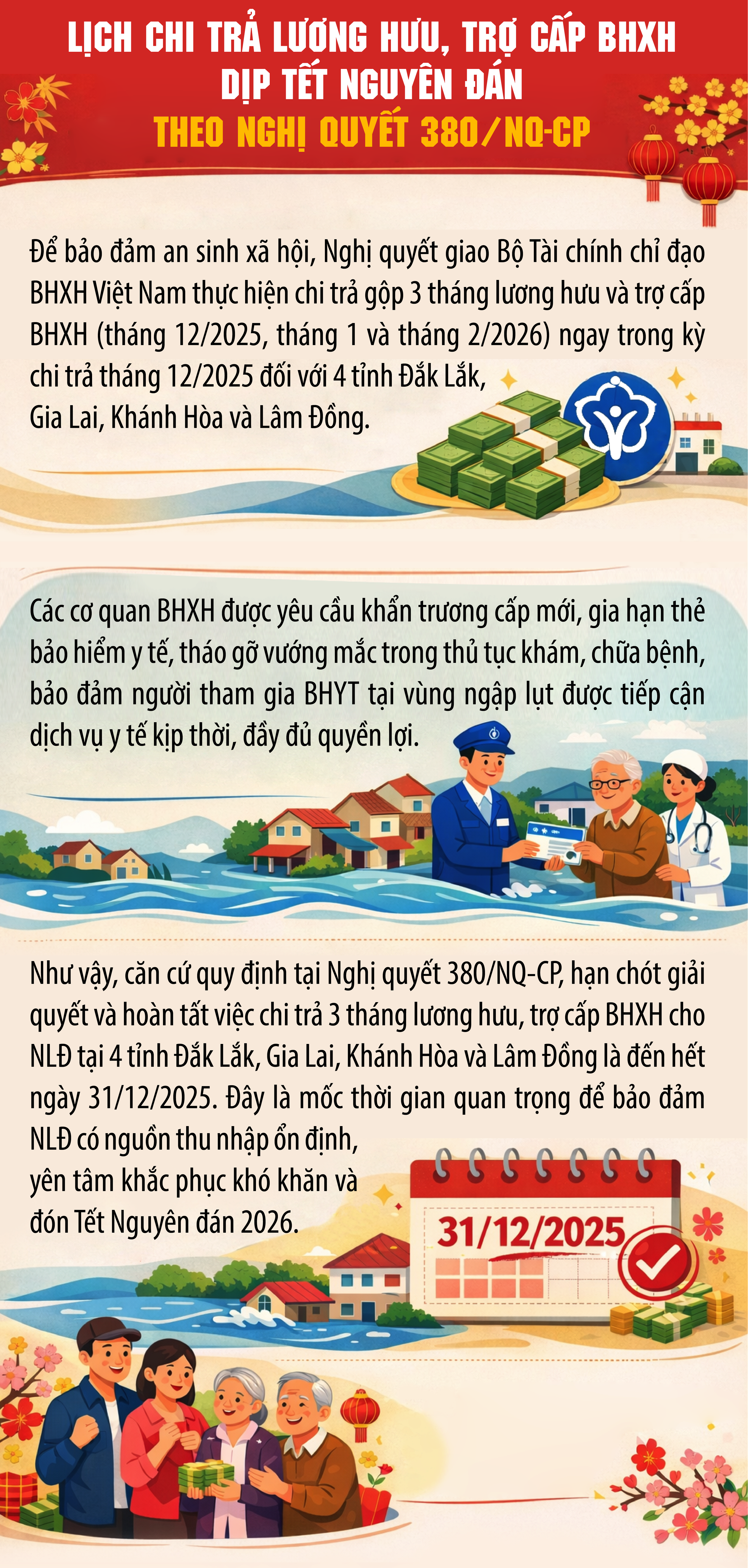 Nhằm bảo đảm an sinh xã hội, tạo điều kiện cho người lao động và người dân vùng bị ảnh hưởng bởi bão lũ ổn định đời sống, Chính phủ đã ban hành Nghị quyết 380/NQ-CP năm 2025 với nhiều giải pháp hỗ trợ khẩn trương, trong đó có việc chi trả gộp 3 tháng lương hưu và trợ cấp BHXH.