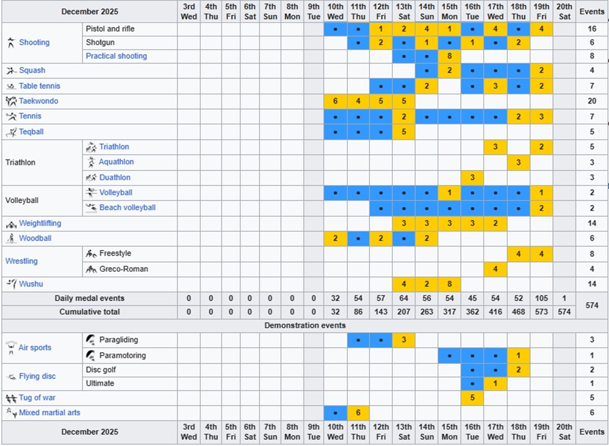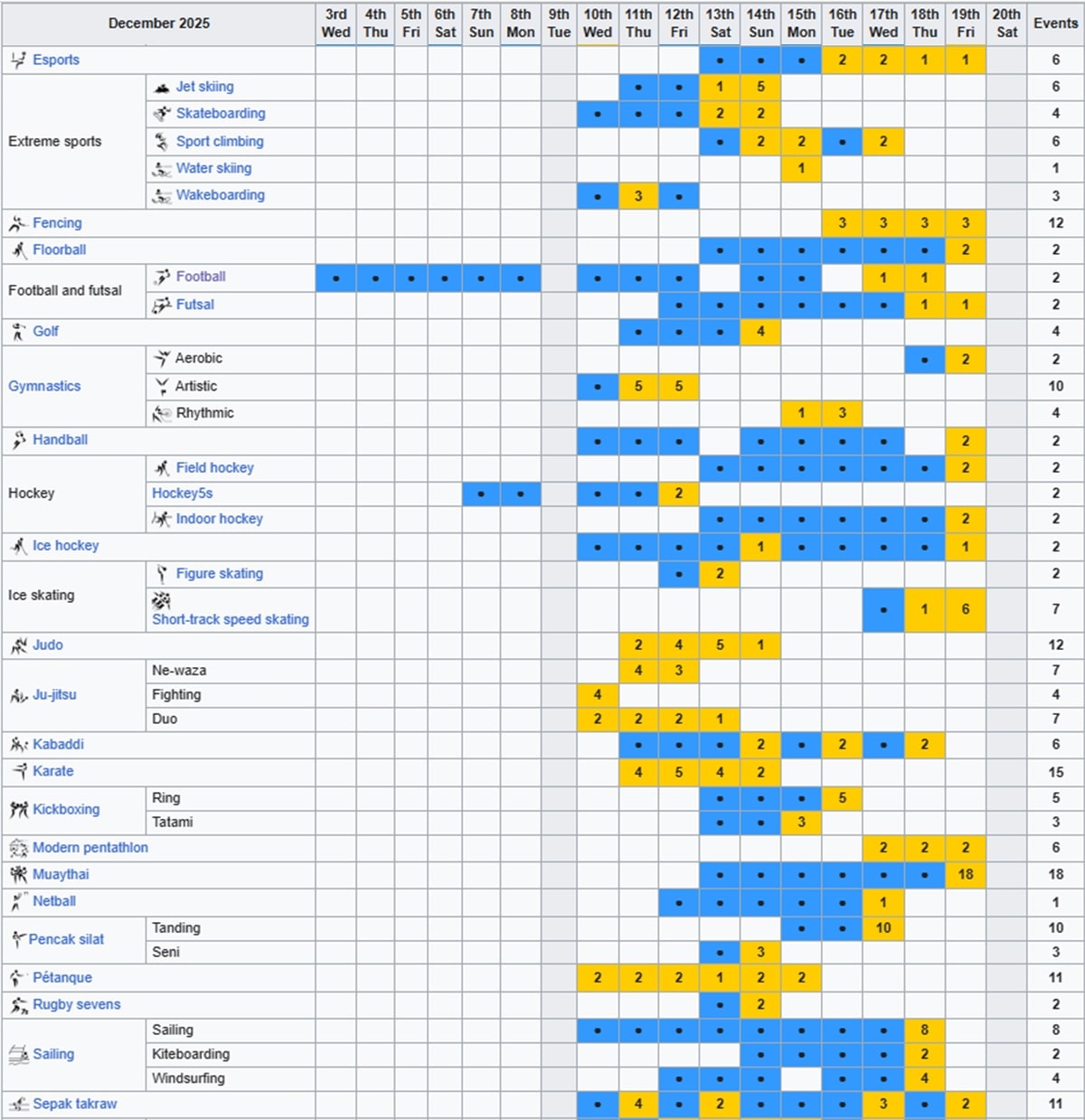 Việc chủ nhà Thái Lan sớm công bố lịch thi đấu giúp giới chuyên môn và người hâm mộ theo dõi sát sao diễn biến từng môn. Đại hội năm nay bao gồm 579 nội dung thuộc 50 môn thể thao chính thức. Ngoài ra còn có một môn đặc biệt là MMA, cùng chương trình biểu diễn 12 nội dung của ba môn gồm thể thao trên không, ném đĩa và kéo co.