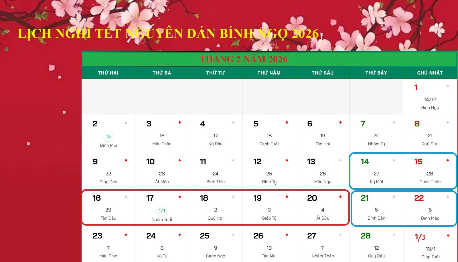 Tết Nguyên đán Bính Ngọ, người lao động được nghỉ 9 ngày liên tục, trong đó 5 ngày nghỉ Tết (khoanh đỏ) và 4 ngày nghỉ cuối tuần liền kề (khoanh xanh).