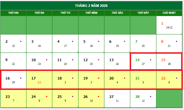 Tuy nhiên, do ngày Mùng 1 Tết Bính Ngọ năm 2026 rơi vào thứ Ba (17/2/2026), nên nếu doanh nghiệp chỉ bố trí thời gian nghỉ đúng mức tối thiểu 05 ngày, mặc dù không trái quy định, nhưng sẽ chưa thực sự thuận lợi cho người lao động. Cụ thể: